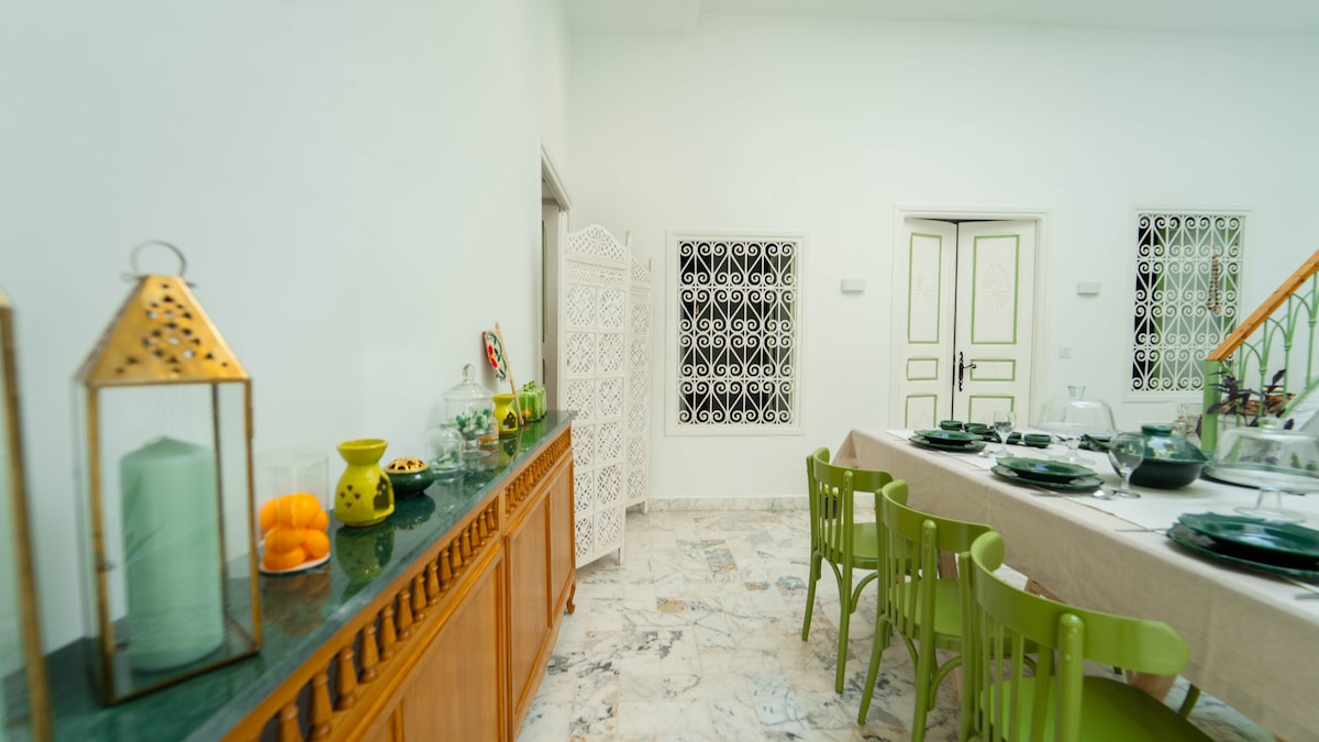 A typical Tunisian apartment with the charm of the buildings of the medina with these ceramics, these cement tiles and its carved wooden windows bathing the apartment in a beautiful white and green light. The blue windows on the background of white walls, the yellow doors typical of the Medina of Tunis, the marble of the stairs... all this will give you the experience of a real experience in the heart of the enchanting Medina of Tunis.