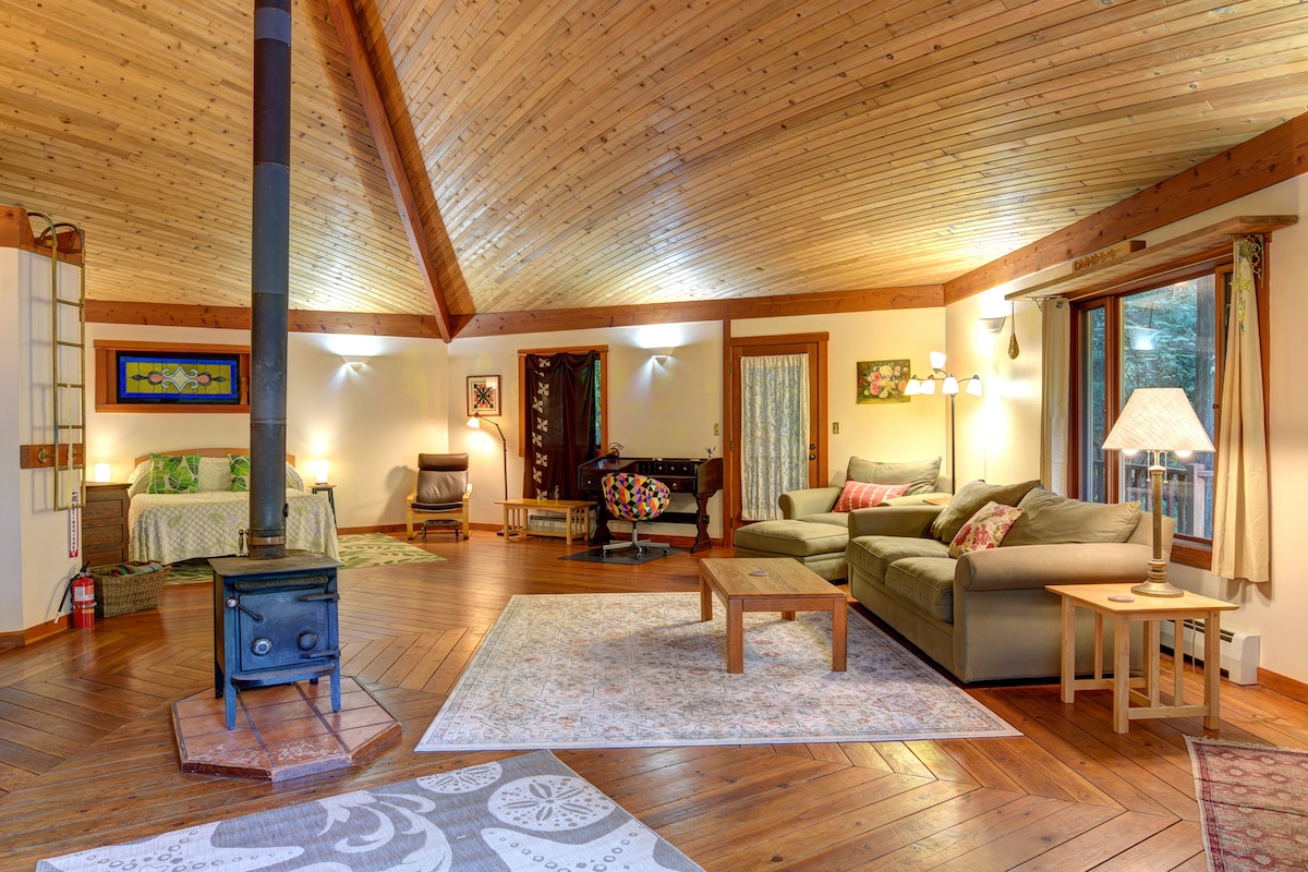 Ghost Salmon Cabin is a custom built studio cabin. It is a unique design, with wood floors, a vaulted wood ceiling and a large wrap around deck. The location is in the Sandy Hook neighborhood. It is not in any town but near several. Kiana Lodge is a 3 minute walk from the cabin. Two ferry terminals (Kingston/Edmonds and Bainbridge/Seattle routes) are 20 minutes away. It is centrally located near Poulsbo, Suquamish, Kingston and Bainbridge Island.
