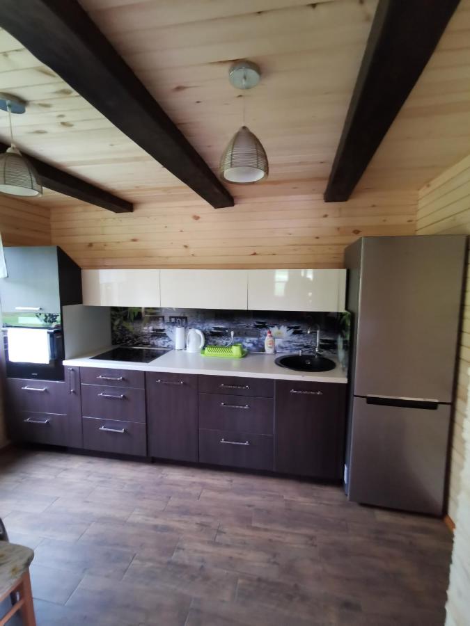 Only 45 km from Vilnius, in the village of Paširvinčiai, in a private homestead, a cozy, stylishly furnished cottage with a sauna is rented for a quiet family vacation. The cottage is located in the shade of royal oaks on a huge pond with a sandy beach for swimming. The river Širvinta flows nearby. Kids will definitely enjoy the swings, swings and trampoline. The holiday home is heated and suitable for rent all year round.
