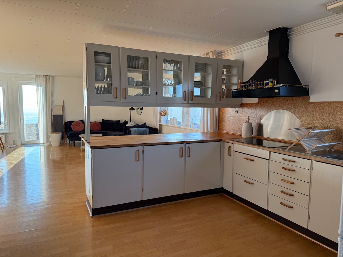 Relax with the whole family in this peaceful home in a home with 360-degree panoramic views. The house has a large entrance hall. Open kitchen-living room in direct connection with the living room. The house has a very large bright living room with nice west-facing views with further access to the terrace. Toilet with bathtub and underfloor heating. Bedroom 1 contains a double bed and baby bed, room 2 a 1 1/2 man bed, both with closet space.