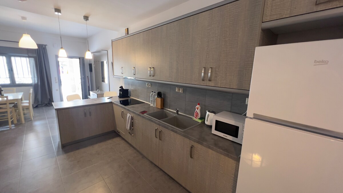 A stone's throw from the center of Polygyros, an independent ground floor apartment of a traditional three-storey house with a yard and parking space. It is located in a lush and quiet area with a magnificent view. New construction built with love and passion by the hosts, with respect to the local architecture, and furnished with family antiques. The location of the house, especially during the summer months, offers coolness and fresh air to the guest.