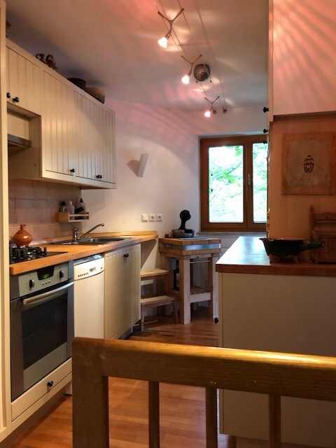 35 sqm shabby-chic, half-basement, garden access. There is a separate bedroom with queen bed and a separate bathroom. Living and dining area with a comfortable sofa bed that sleeps a 3rd person. The tea kitchen facilities include mini fridge, microwave, toaster and water heater. No stove. Coffee and tea provided. Outdoor sitting area is in front of the apartment and you can use it as much as you like. Free private parking on the premises. Grocery shop is just a few steps away open from 7am-9p