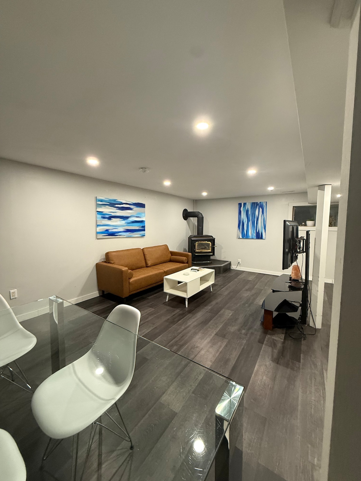 Welcome to our centrally located private unit. Big windows to brighten the fully stocked kitchen, an entertainment space with a 55” smart tv, board games, record player, a comfortable bedroom with a Queen bed & AC unit, and large bathroom. Enjoy the private outdoor area beside your personal parking spot. Kitchen includes: - Toaster - Keurig Coffee Machine + Reusable Cups - Stove - Kettle - Pots and pans - Utensils and other kitchen ware - Microwave - Mini Fridge with a freezer compartment