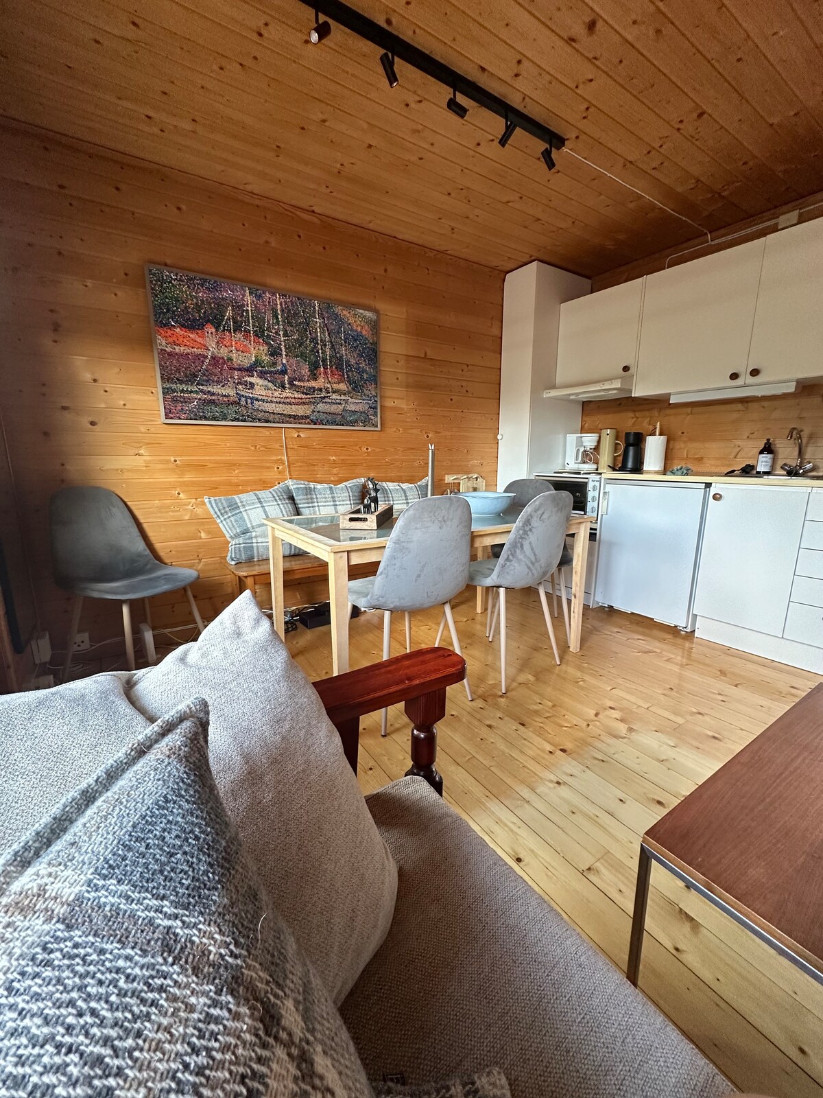 Our garden house has a plain Norwegian cabin standard with everything you need for making simple meals. Some basic food supplies will be available. As we have no running water in the garden house, we have placed a water dispenser in the kitchen area. Your bathroom, with floor heating and shower, is situated right next door, in the main house. The garden house has its own terrace, with access to the garden.