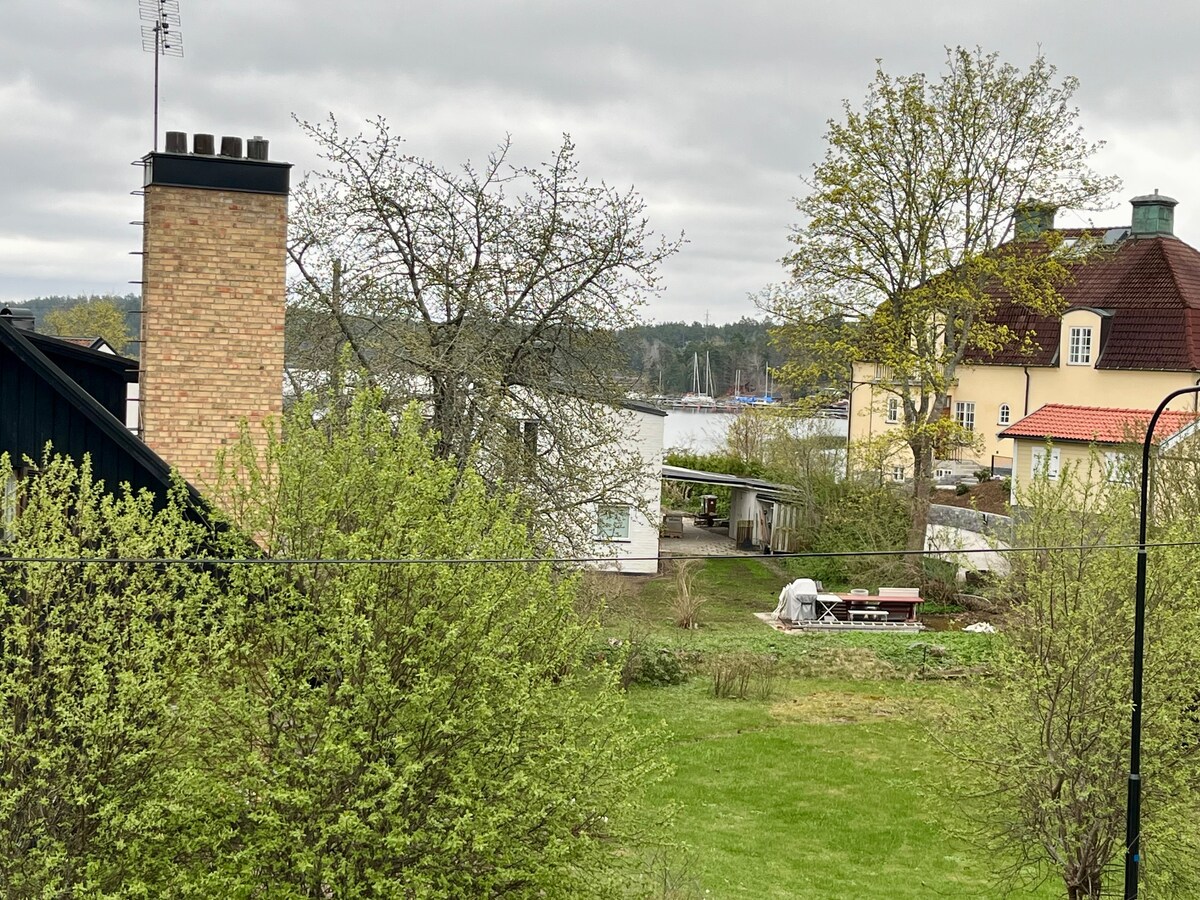 Charming 130-year-old cottage (90 m²) with a modern yet cosy feel. Two renowned spas (Yasuragi & Skepparholmen) within walking distance. Bottom floor: kitchen and dining area with classic wood stove, living room and bathroom. Your own garden and spacious wooden deck—perfect for sunbathing or BBQs. Set in a beautiful area with a crystal-clear lake for bathing just 200 m away, with a nature reserve surrounding it. Sea dock ~700 m. 30 minutes to Stockholm by Waxholm boat, bus or car.