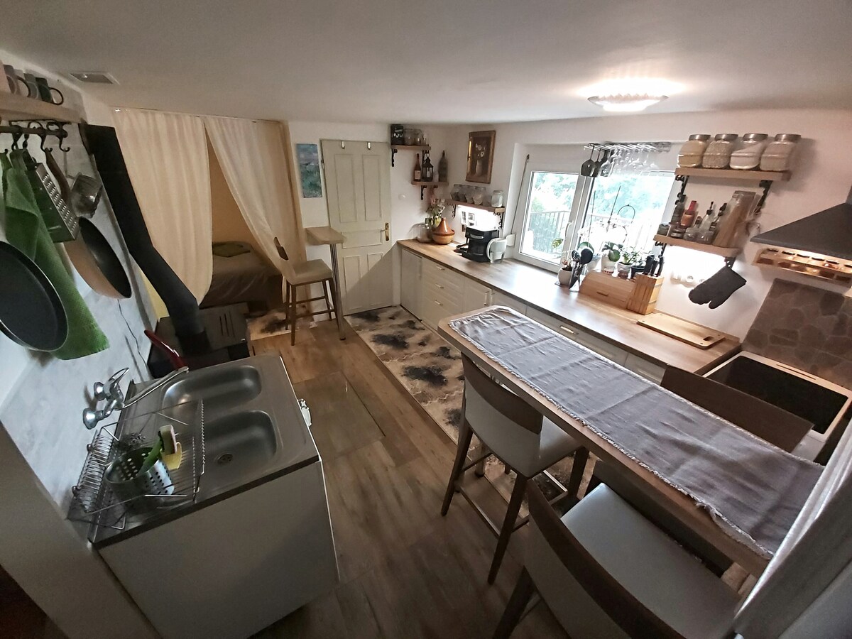 The little house, which is situated on the common land with the family house we live in. The house has a terrace with a fireplace and a sitting area overlooking the garden. There are 2 separate rooms and a bathroom with the sauna (for 2 people), which can be used. Bedroom has a queen bed, the living room is equipped with a pull-out couch offering comfortable sleep for 2 guests. There is no kitchen, so you can´t cook. There are fridge, Nespresso coffee machine , kettler, plates, glases, cutlery