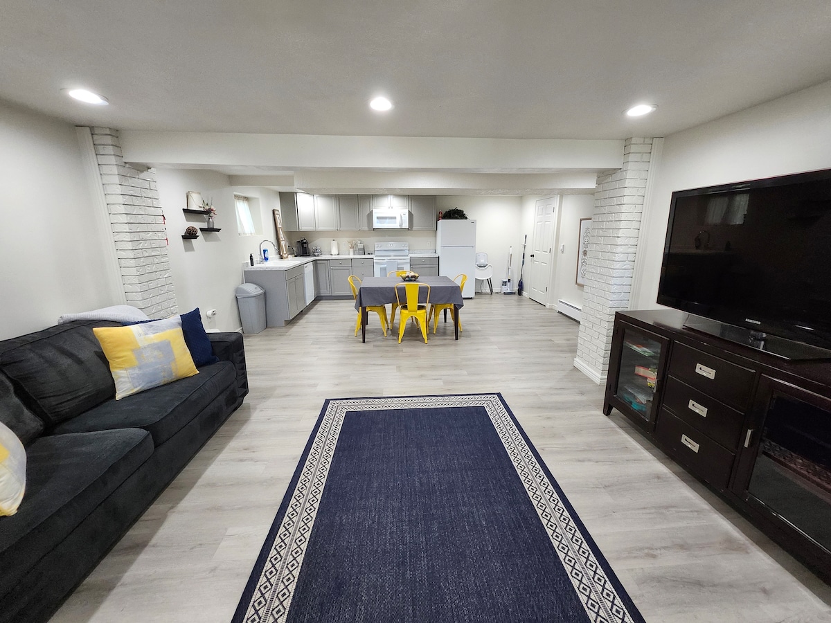 Enjoy our all new furnished suite with a private entrance and off street parking in a beautiful mature neighborhood. Our cozy comfortable great room includes a 50 in TV with 285 channels and Roku. Enjoy the remote controlled electric fireplace with awesome colors and adjustable thermostat. Cook at home with a kitchen ready for any meal. Charge your electronics with a USB and USB-c charging Outlet. If your looking for more privacy head to the quiet master bedroom and turn the second TV.