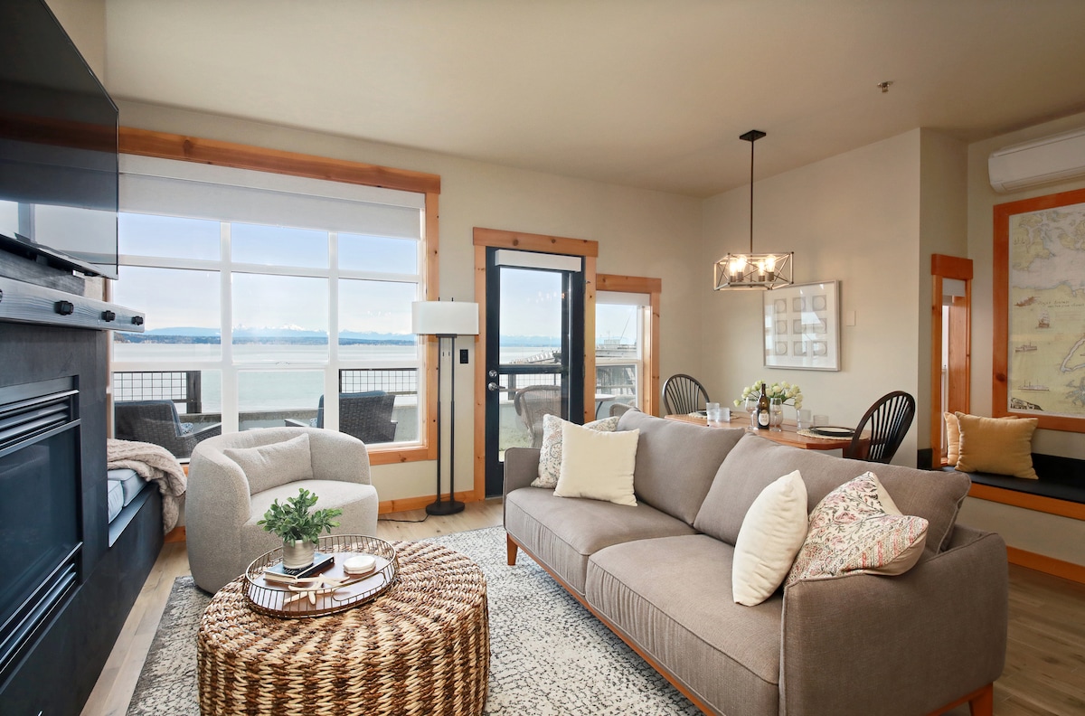 Explore, unwind & experience the charming seaside village of Langley on Whidbey Island. Our modern condo in downtown Langley features a mix of high quality mid-century modern furnishings with contemporary artwork thru out. The primary and guest room reflect the highest quality beds and luxury linens. In the living room cozy up by the fireplace or cook a gourmet meal in our fully equipped high end kitchen. Off the living room there's a private balcony which overlooks a tranquil green space.