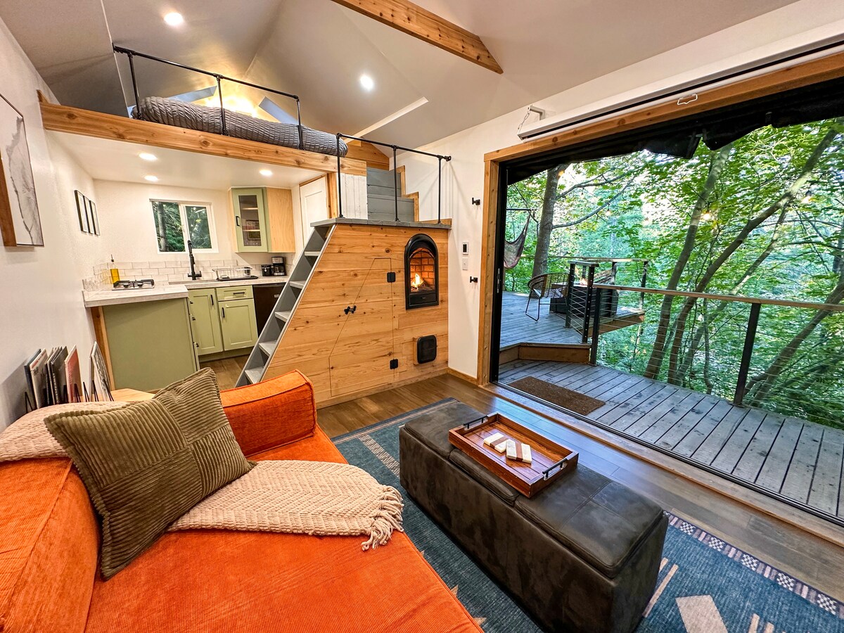 Fall asleep to Bear Creek and towering hemlocks in this tiny treehouse home set in old-growth forest. A deck 20 feet up offers elevated creek views, and private trails connect to thousands of acres of wilderness. A 9’ folding glass wall and full-glass shower open the cabin to nature. Smart projector, convertible couch, and a king-short loft bed make every inch of this small footprint comfortable. Small space, big adventure.