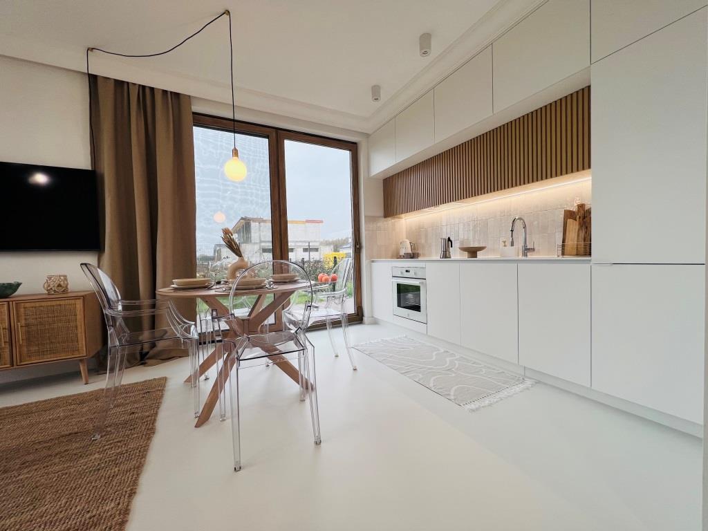 A comfortable, spacious apartment, perfect for a trip to forget and calm down. The apartment is located in a newly built building, on the ground floor, with an exit from the living room to the terrace with a garden, a spacious bathroom with a shower. The apartment is finished with attention to the smallest details, which makes it an ideal place for a trip for two or with a family. The property is located in an extremely quiet and peaceful area, surrounded by the wild nature of the charming Sobieszewo Island.