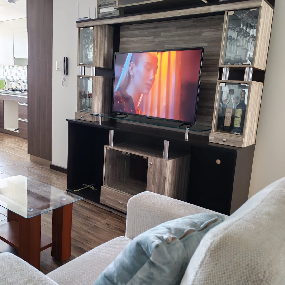 Brand new modern mezzanine, with terrace and grill! Equipped with a work table ideal for working from home with high-speed Wi-Fi, 65" TV, bedroom with a full bed. Living room, kitchenette with everything you need for cooking. Located on the 3rd floor, stairs must be used. Terrace with grill and street view Located in the José Luis Bustamante district, 5 minutes from the U. San Martin de Porres, Tecsup, Mall Aventura Plaza, OutletArauco and 15 minutes from the Historic Center