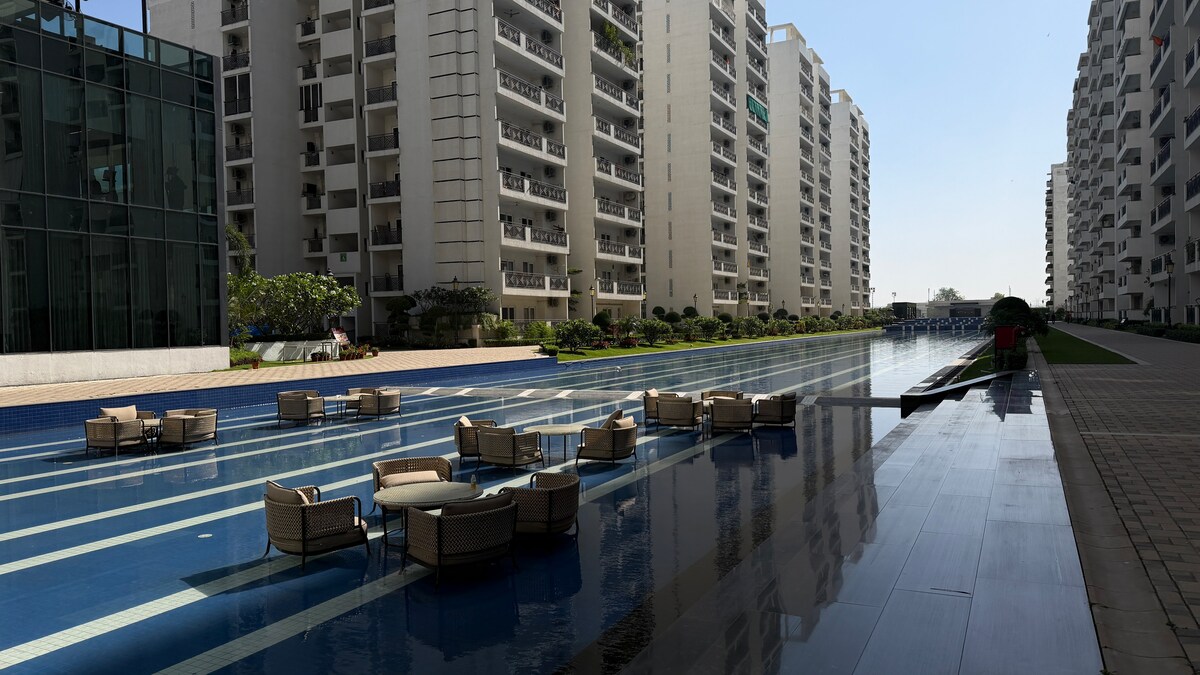 Modern 1BHK in Central Park Flower Valley. Sunlight fills the bedroom with a king bed and calm interiors. The balcony is a little wild, making it perfect for fresh air, chai, or a smoke under open sky. Kitchen is fully set for basic cooking. Smart TV, Wi-Fi , AC + inverter backup keep you comfortable. Great for business trips, short stays or slow weekends. A peaceful pocket of soft luxury in Gurugram. Soft daylight in every corner feels designed to breathe with a beautiful Aesthetic pool View.