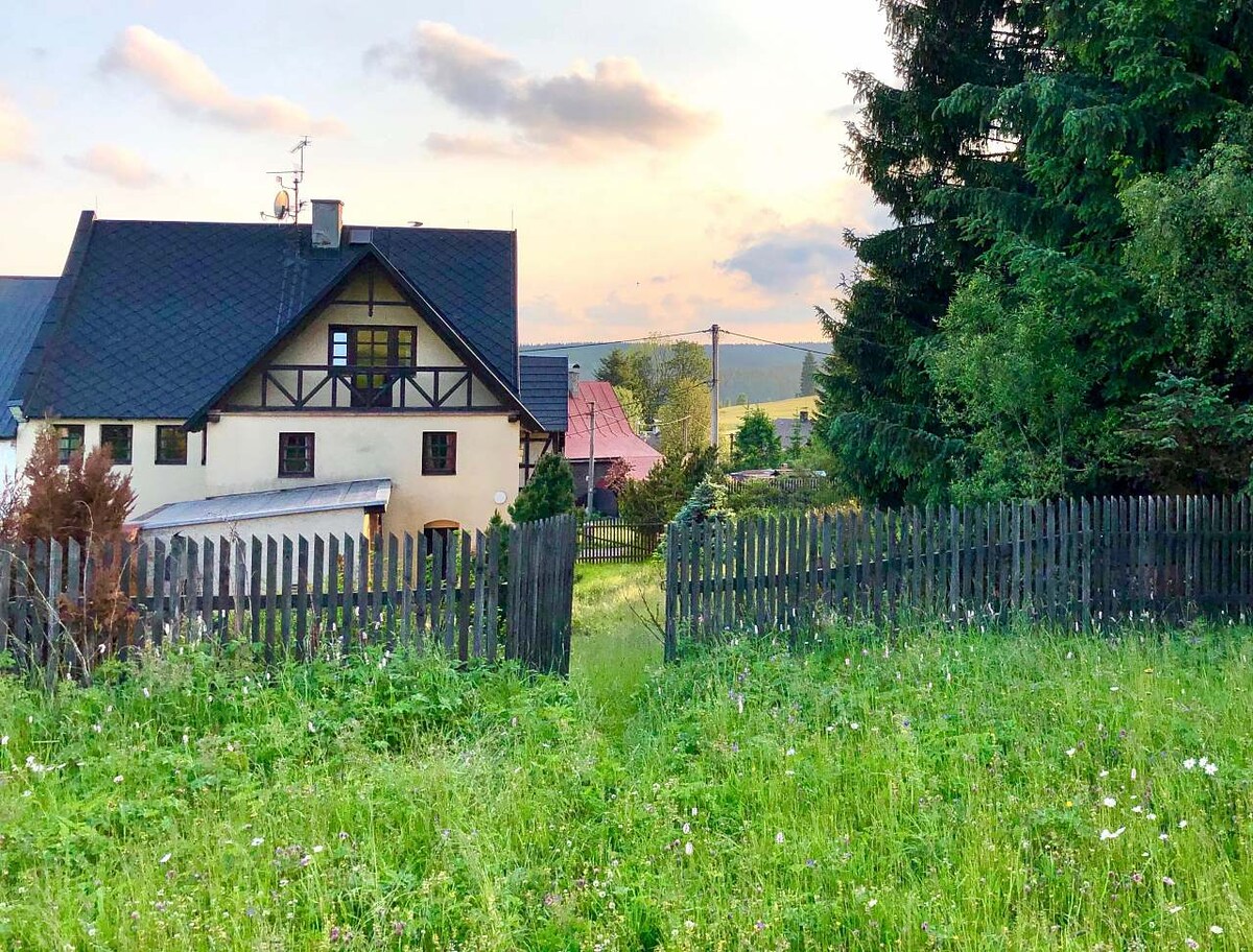 The mountain cottage is located in a quiet part of the Ore Mountains village of Stříbrná at an altitude of 665 meters above sea level. It stands on one of the hiking trails leading to the top of Špičák (991 m), surrounded by a garden with mature greenery ensuring complete privacy and tranquility during your stay. The cottage has a beautiful view of the countryside and the surrounding hills. It's just a few steps to a forest full of mushrooms and blueberries. The surroundings offer plenty of opportunities for an active holiday and for discovering the natural and historical beauty of the western Ore Mountains.