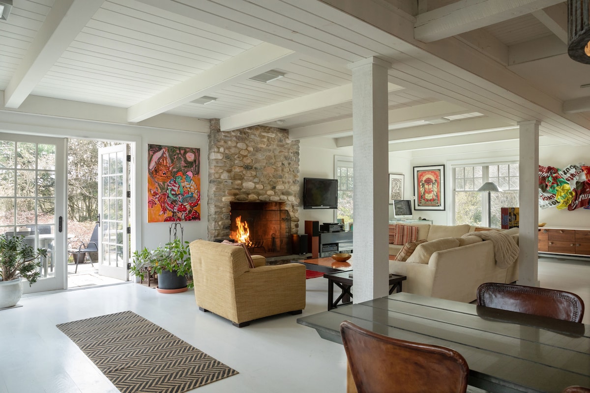 Private, tranquil historic Stone Cottage, situated on 11 woody acres of a colonial Buckingham Hills farm estate, cir 1793 minutes from Peddlers Village, New Hope, Lambertville, Doylestown. Cozy, romantic decorated with unique antiques and comfortable furnishings. Relax by an oversized wood burning fireplace, enjoy a large screen smart TV, explore the property & stargaze by an outdoor fire pit! Retrieve to the 2nd floor spacious master bedroom with an extra plush king size orthopedic mattress.