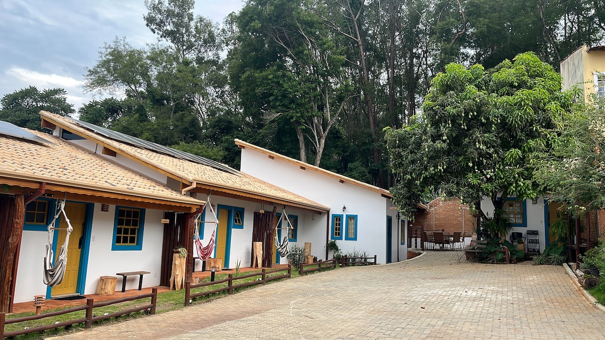 Kitnet with grassy yard, garden, hammock, garage, fire pit area and lots of greenery, in the countryside 5 km (20 min by car) from São Lourenço. Located 4 min (dirt road) from the Doutor Jonas Pereira Maduro Beltway and close to the Suddhavāri Buddhist Monastery. You can enjoy all the tours of São Lourenço and cities near the Circuito das Águas and the peace and quiet of the Minas Gerais countryside!