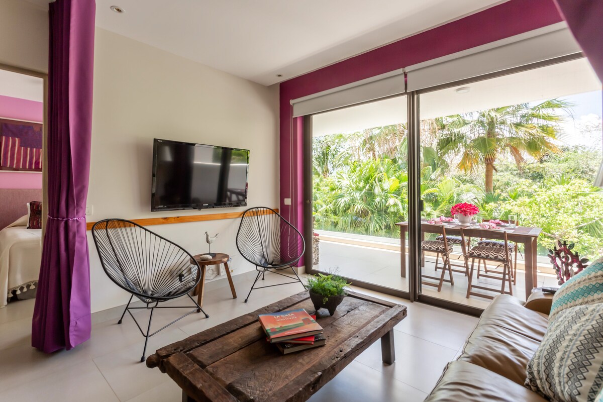 2 min walk to sea, in the famous 5th Avenue with 34 street in a safe area, this fantastic apartment is perfect for who likes good style of life. Private terrace with jacuzzi looking to a tropical garden, free WIFI Internet and private car parking. Aluxeshome has a big leaving room with a sofa coach bed, a bedroom, 2 bathrooms and a kitchen. Elevator and security guard. Close to the best Beach Clubs, Restaurants, Cafes, shops, Arts and music locals. Easy to reach by ADO bus, taxi or car.