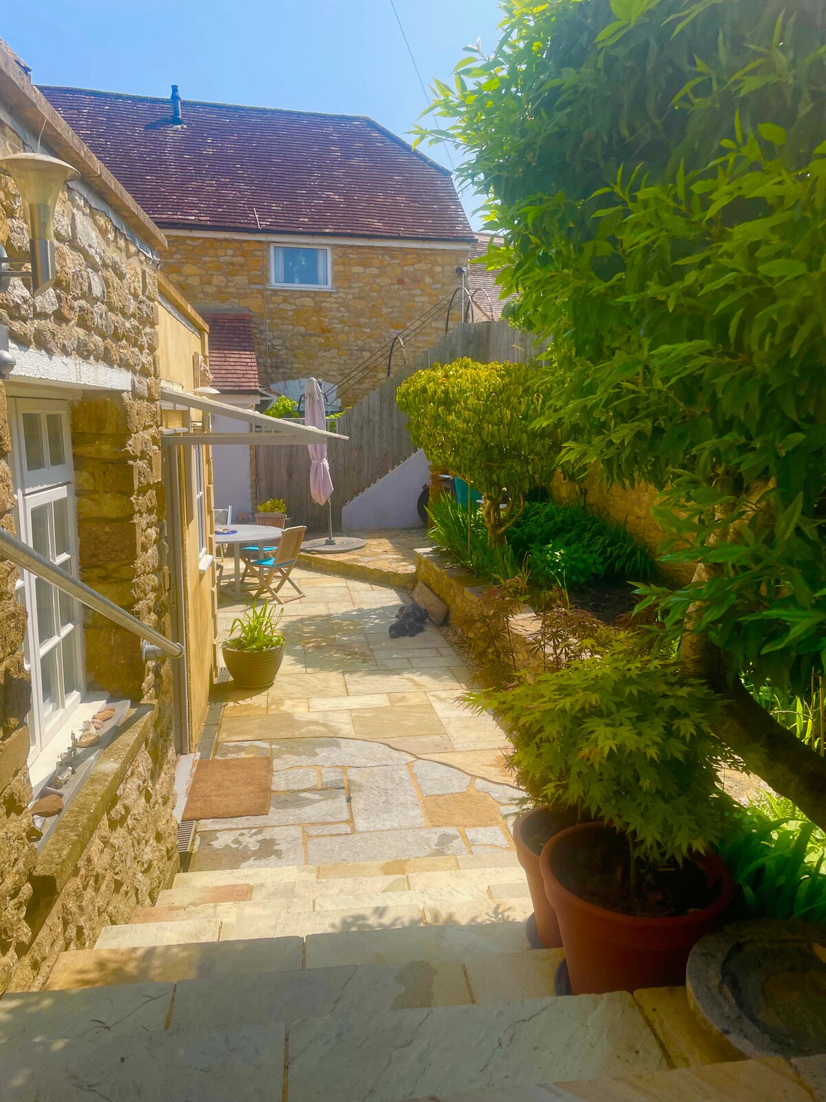 Central Beautiful Sherborne with Private Parking & Garden. Spacious bright interiors, 5 mins walk to the Abbey, shops, Schools & train. Two bedrooms & Sofabed (NB-see notes) large modern kitchen & bathroom on the ground floor with private sunny enclosed ‘Mediterranean’ south facing garden Longer stays for parents at Schools, a great base with comfy Sofabed in sitting room sleeping 5. Stunning garden is perfect for summer days/evenings! FLUFFY FRIENDS WELCOME PLEASE NOT TO BE LEFT UNATTENDED