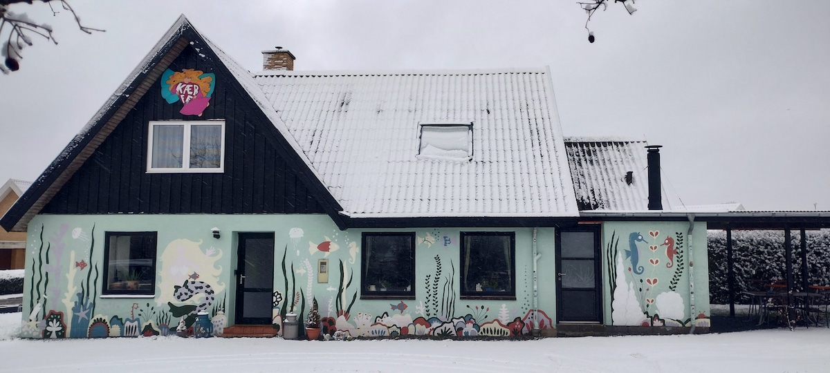 Bring the whole family to this great place with lots of room for fun. There is a lovely garden with plenty of opportunity for play. There is a trampoline, playhouse, mud kitchen and sandbox for children. The horses walk in the field right up the garden. There are lots of games and things for creative play indoors. A real family oasis. Small allergy-friendly dogs are allowed. There are several lovely beaches, good restaurants, and an active city life. The beach Kerneland is about 15 km from the house.