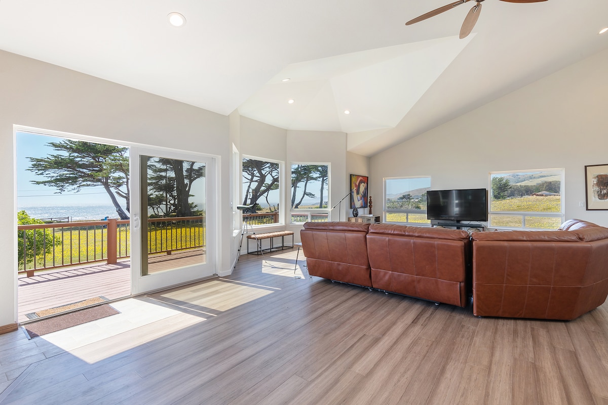 Never out of sight and sound of the Pacific, Altamar sits on an idyllic 2.5-acre ocean-front lot across from Schoolhouse beach and its tide pools. The dramatic shore is past the lawn, peaceful hills rise to the back, and wildlife abounds. Altamar is perfect for groups and families. Soak in the views from the comfort of the house and decks. Play foosball or pool in the garage playroom. Meditate or mingle in the garden. Let kids enjoy the park-like setting, outdoor games and the secret tree fort!