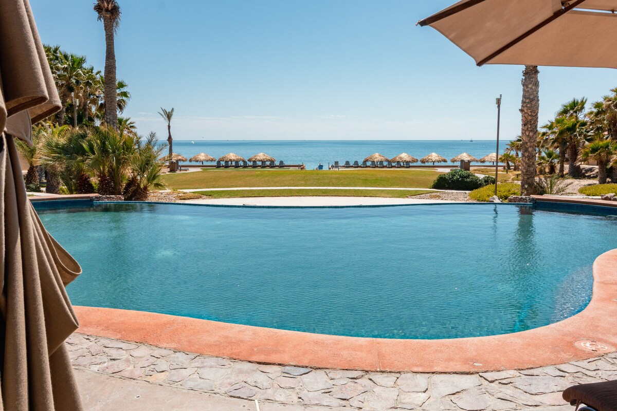 Oceanfront 1BR condo at Bella Sirena with breathtaking Sea of Cortez views from the moment you walk in. Enjoy a private balcony perfect for sunsets and relaxing by the ocean. Features a king bed, full bathroom, and a comfortable living area with a queen sofa bed. Ideal for couples or small families of up to 4 guests seeking a peaceful beachfront escape