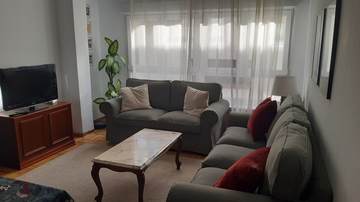 A rustic-style property, in the heart of downtown but quiet, overlooking a clear natural landscape. All amenities are on the street. Sunny morning and afternoon. Spacious layout: three double bedrooms; one type suite with bathroom, spacious living room, kitchen office, microwave, dishwasher, kitchenware... Community garage included in the price for 1 car and 1 motorcycle. Video doorman. Armored. WIFI. FURNISHED CRIB. BABY HIGH CHAIR.