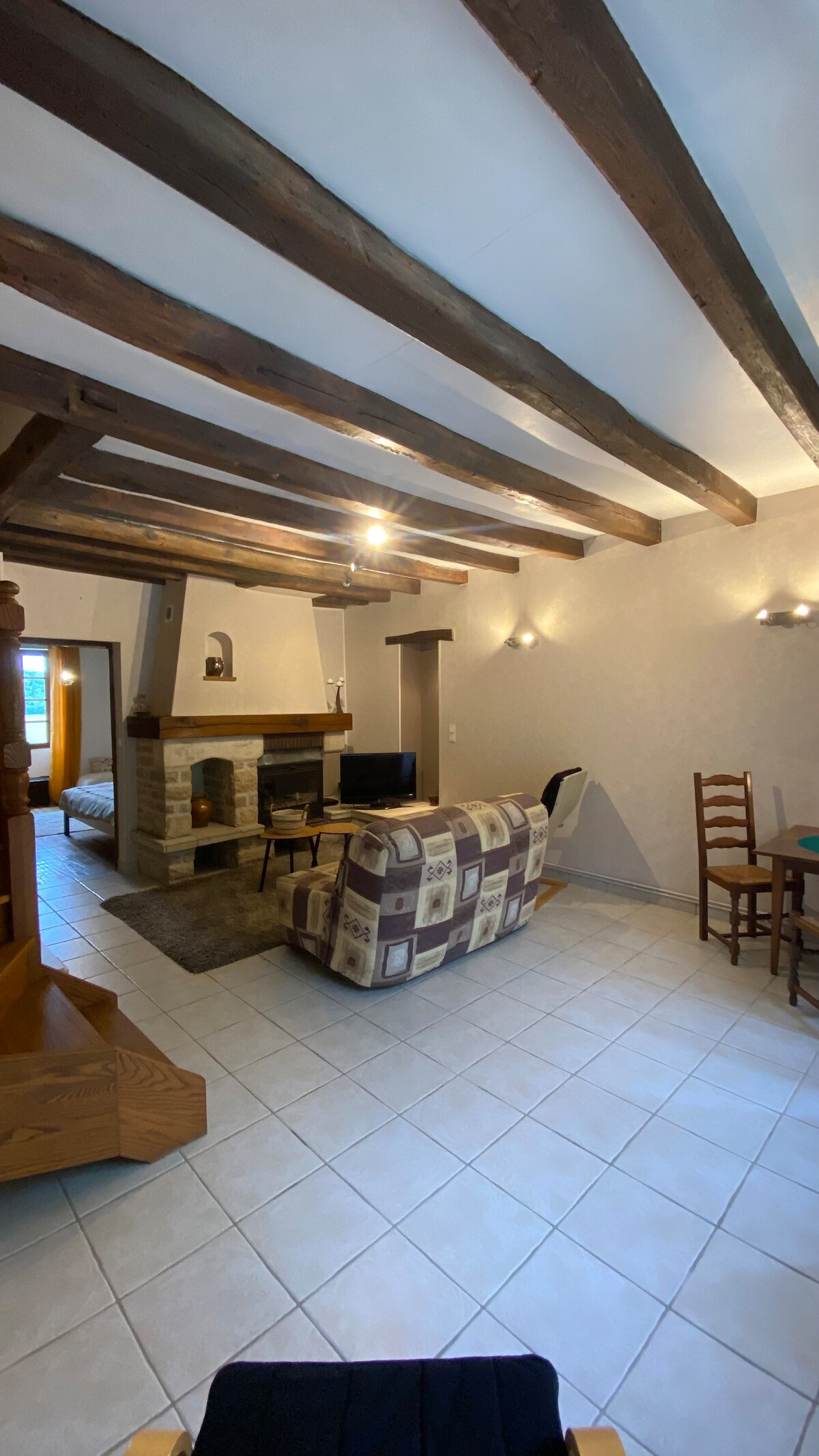 Cool, comfortable and spacious (90m2) home on 2 floors. Large kitchen , lounge and terrace on street level and fabulous 1 double bedroom open plan room on the 2nd floor. A converted grange perched on a mountain in a medieval village 16 minutes from the A6, this peaceful home makes an ideal stop over for holidays in the Alps or south of France. Please note - there is a studio apartment with its own entrance on the lower ground floor - rented separately.