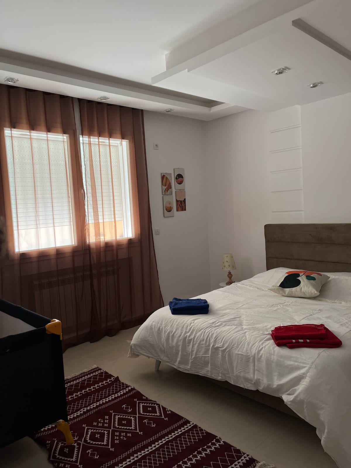 A wonderful, very high standing S+1 apartment 20 minutes from Monastir airport and 2 minutes from Carrefour supermarket, it is composed of a bedroom with a large dressing room, living room, dining room, bathroom, well-equipped kitchen with oven, washing machine, microwave, it is heated, air-conditioned, bed linens, sheets and towels available, possibility of having (on request, for a fee) babysitter, private driver, airport shuttle service, housekeeping service, manicures and pedicures.