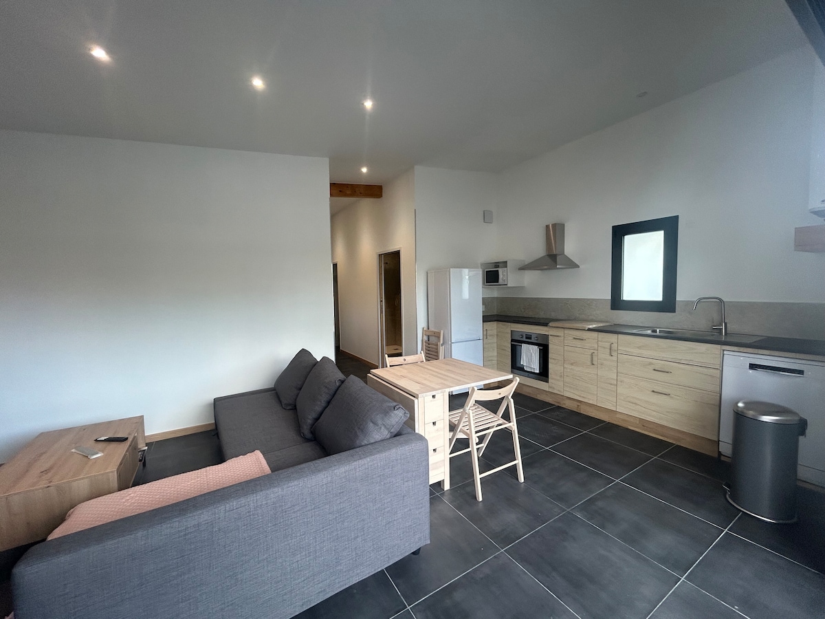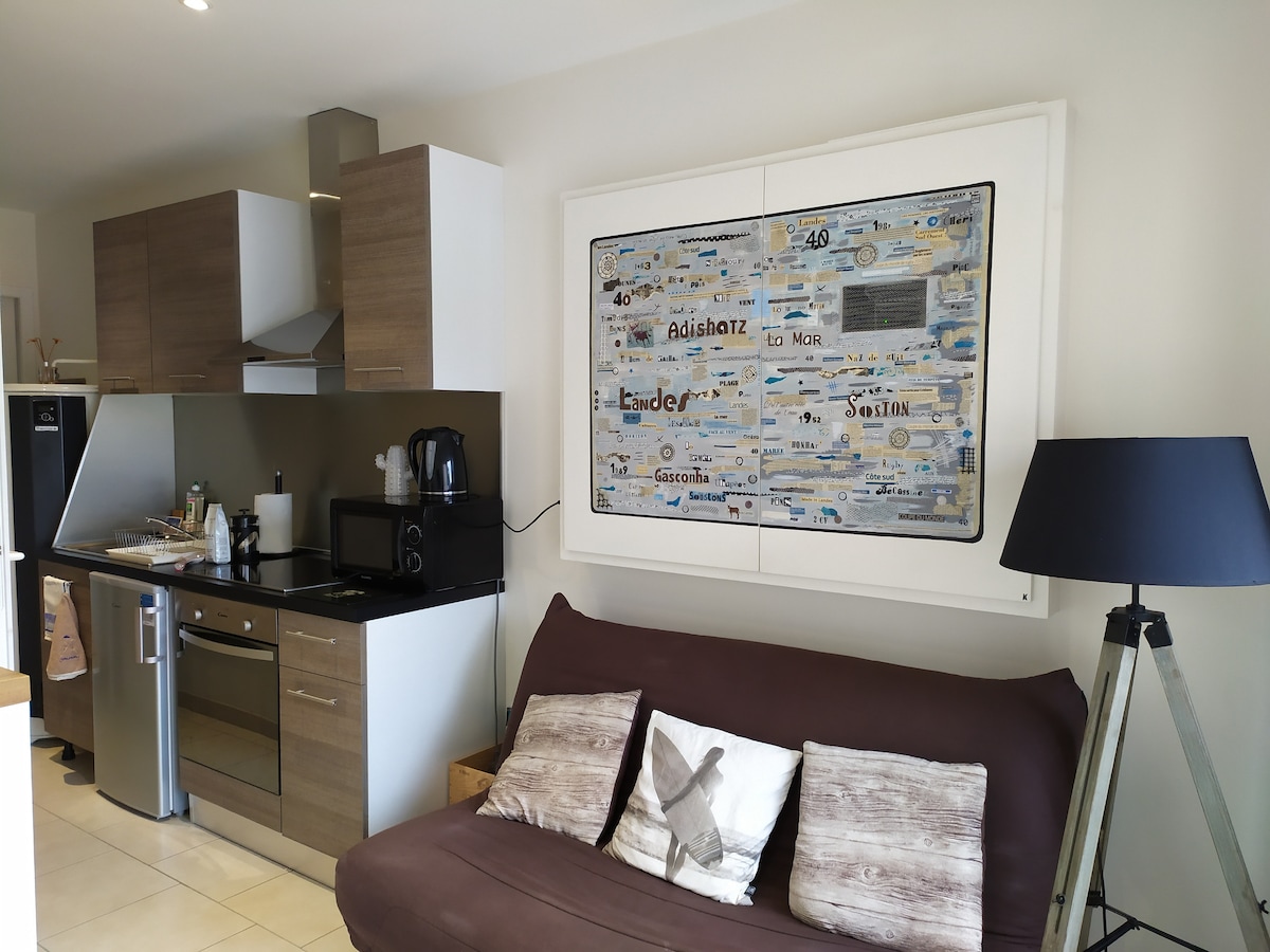 Come and enjoy this elegant lodge completely renovated in the city center, close to the ocean and forest. You will be seduced by its neat decor, its different spaces designed for your comfort with beautiful services and its garden away from prying eyes. It offers one bedroom and can accommodate up to 2 guests. At the back of our garden, you have peace and quiet and perfect privacy. Close to shops on foot. Bed linen and towels are provided as well as 2 bicycles.