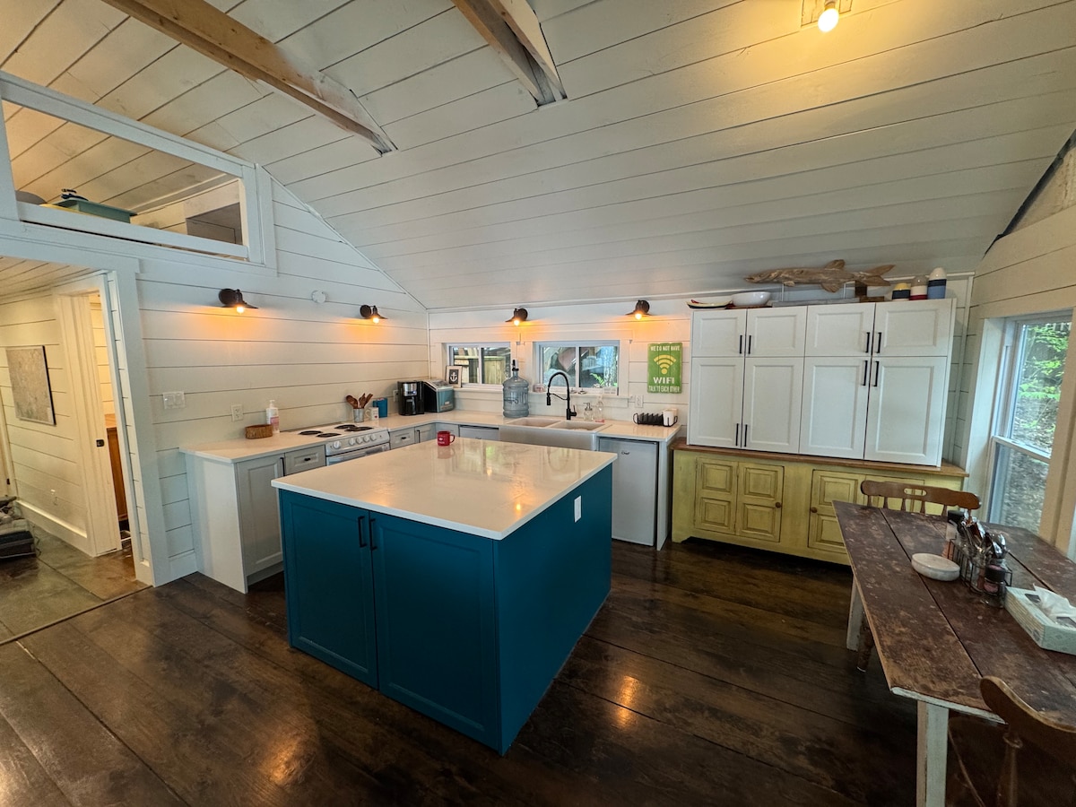 This is a quaint cottage on a restful lake. The cottage is newly renovated in a industrial/modern style. Extensive windows provide fantastic views. Open concept allows for easy/relaxing entertaining. There is a private boat launch with small creek that runs through the property. Canoes, kayaks, sailboard and paddle boat come with the rental. Pets are welcome.