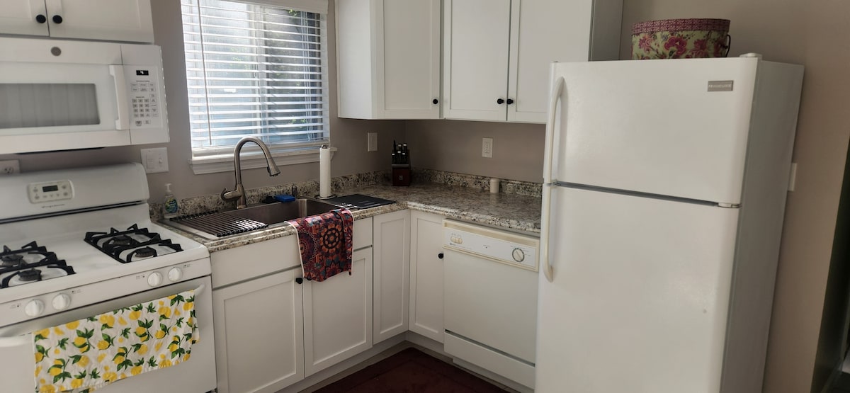 This is a private guest suite (FULL lower level walkout - approx 1,750 sq ft) within our larger 3-story occupied home. A comfortable home-away with 2 bedrooms, 1 full bath, living room, and kitchen with full-frig, dishwasher, coffee maker, electric range, toaster oven, microwave and counter that seats 6. New mattresses, bedding, pillows, and towels. Guests welcome to use back patio area with natural fire pit, covered pavilion with gas fire feature, grill and hot tub. Great Wifi and Smart TV.