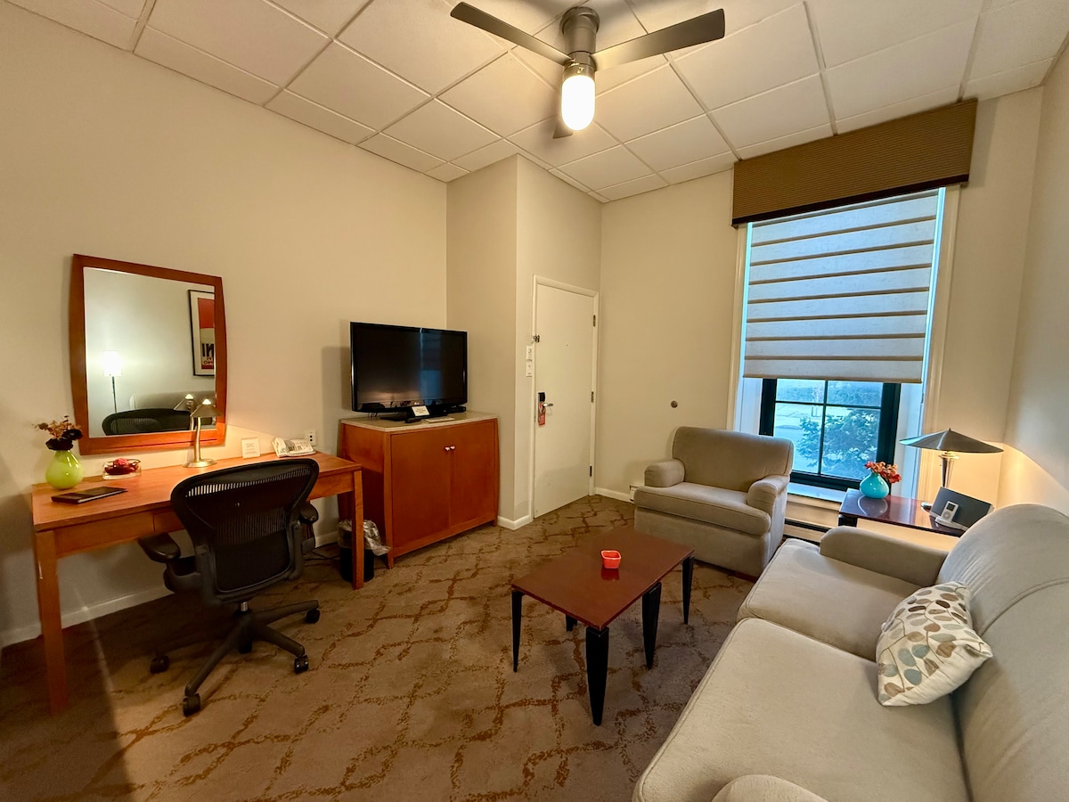 Welcome to Lindsey Place, a charming retreat in historic downtown Lock Haven. This cozy one-bedroom suite features a plush king bed, relaxing living area with TV, and a well-equipped kitchenette. Enjoy access to a peaceful courtyard with outdoor seating and a hot tub. Just steps from shops, restaurants, and the scenic Susquehanna River Walk, Suite 9 offers comfort, convenience, and small-town charm for your stay.