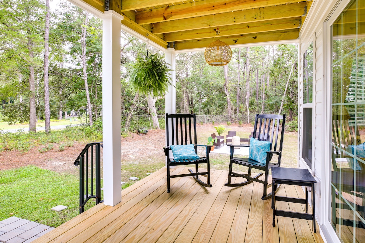 Charming, renovated cottage, just blocks from downtown. Ride the 6 seat golf cart to shops, waterfront swings, live music, riverfront dining, and spectacular sunsets. Only a 15 min car ride to Oak Island’s beaches & golf. Unwind in the gazebo, play bocce, or snuggle up for a movie by the fireplace. Sleep soundly in plush queen beds. Enjoy a clean kitchen with Keurig & lattes. Three smart TVs, 1.5 bathrooms and washer/dryer. Must be 24+ yrs old to book. (Signed waiver requested after booking).