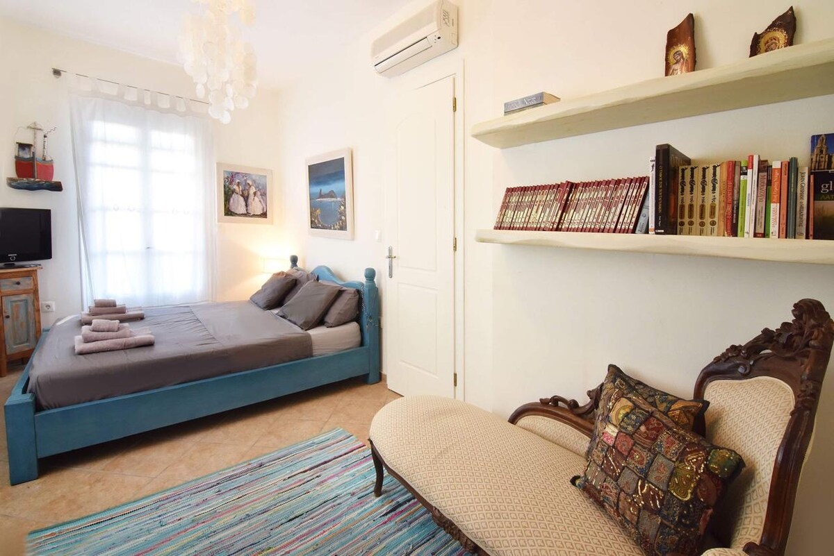 If you have seen “Glass Onion: All knives out”, it’s the villa in the intro of the movie (from 13:00-18:00). Unique location by the sea close to everything: the iconic Poseidonion Hotel, the island centre, two open-air cinemas, the market, restaurants, cafes, bars, beaches,everything in walking distance and with the best views of the sea and beautiful sunsets. 4 bedrooms, that sleep 8-10 people, all with their own bathroom, various outdoors terraces, nice spacious bright kitchen.