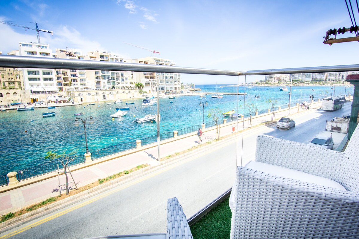 Luxury seafront Apartment with a south-facing balcony overlooking the stunning seaviews of Spinola Bay. Situated very close to the promenade,restaurants,cafes,bars,shops and a short walk to the beach. This 1 bedroom plus 1 bathroom apartment is exclusively designed with marble floors, kitchen/living/dining with top notch appliances, 55’’ TV and Giga Herz internet. 4 corner glass railings of the balcony allows one to enjoy their breakfast/lunch/dinner in the shade during the summer & winter days.