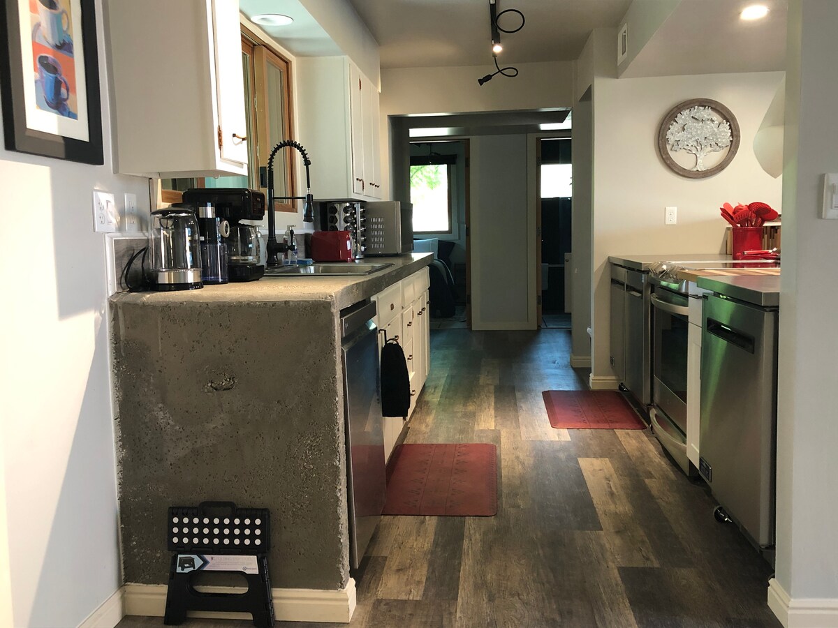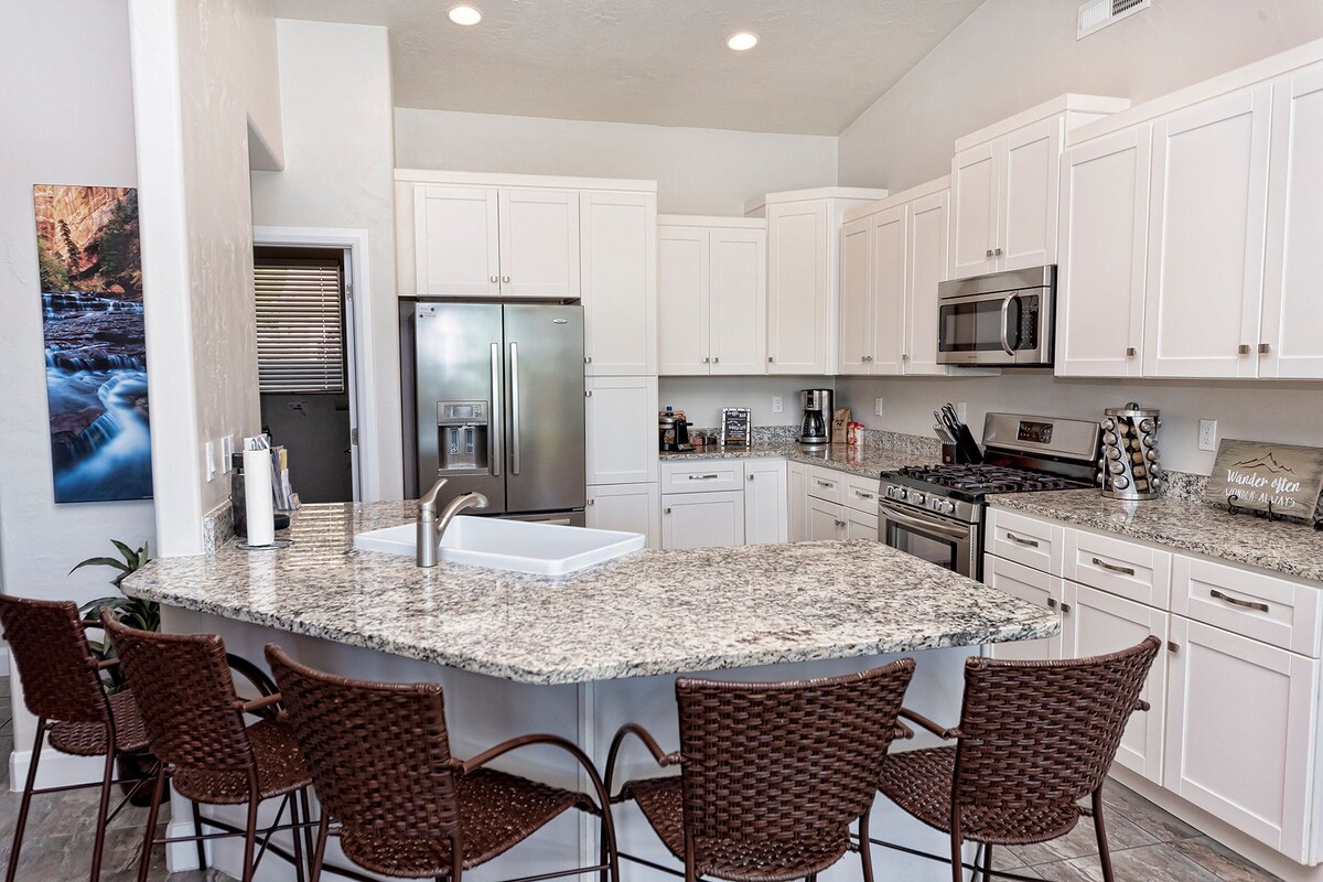 Zion NP's gorgeous peaks are just outside your window & the park entrance is only 1 mile away, making for the perfect hike or bike ride! This 1st floor space was renovated for those excited to wake up to beautiful views, explore during the day, return to cook in a full kitchen, have a nice meal, relax at the exquisite hand-carved wood bar, and enjoy the peaceful Zion evenings. The Watchman View Haven is the perfect place for a Family vacation, Friends trip, retreat, or an Adventurers' base-camp!