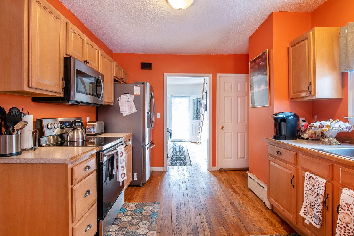 Relax with the whole family at this peaceful place to stay. The unit is part of a two family duplex house. You and your family will have the entire unit to yourselves. There are two bedrooms with queen size beds, a living room, kitchen, bathroom, and laundry room. The living room has a TV, fireplace, and Netflix. There is also a fenced in back yard with a patio and outdoor dining area as well as a firepit. The house is also pet-friendly.