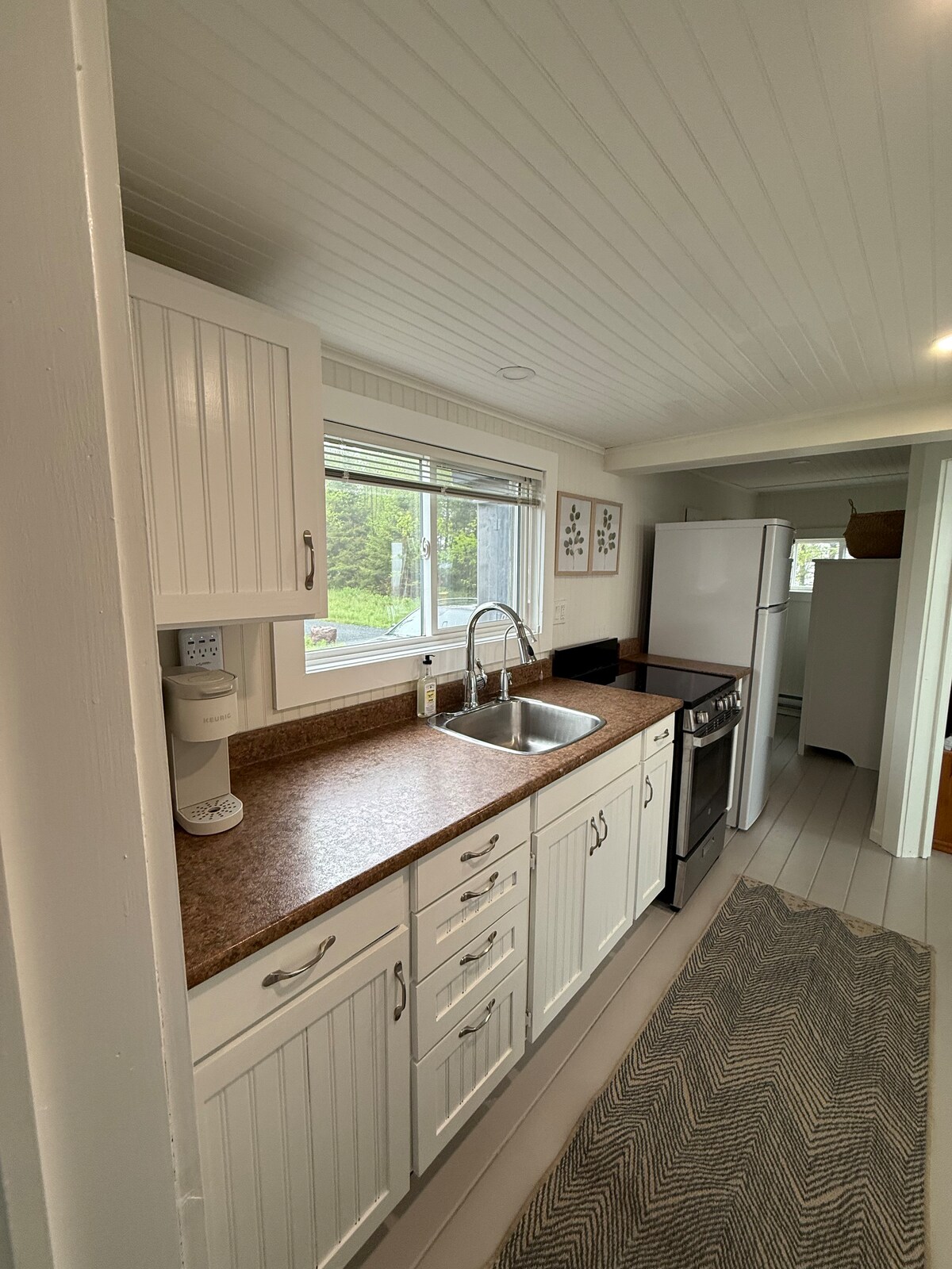 Modern studio apartment in a historic building in Eastport Maine. 460 sq ft with private deck, king-sized bed, sitting area w/gas stove, galley kitchen, and bathroom. Walk-out second story deck overlooks large side-yard and has table, umbrella, and chairs for outside dining or simply enjoying the day. Private entrance and off-street parking. Well-equipped kitchen w/ refrigerator/freezer, Keurig, kettle, toaster oven, cookware, knives, utensils, dinnerware. Large closet with vacuum and heater.
