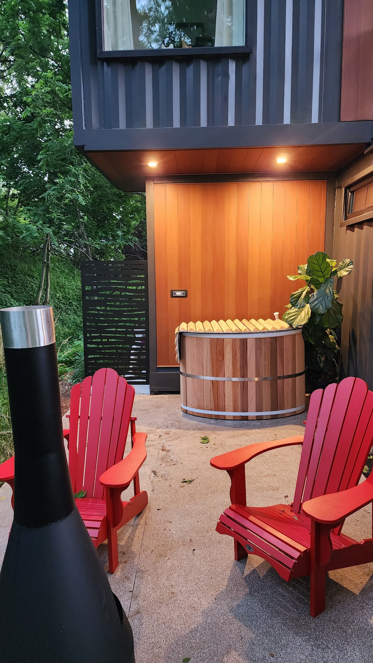 The Eh Frame is a 3-story, Scandinavian-inspired luxury cabin with two fully separate units: the Sunrise and Sunset Suites. Your group will have exclusive access to the Sunrise Suite (everything shown in the photos), including two bedrooms, a patio, a private spa, and a fire pit. The front unit, Sunset Suite, is a separate rental. A full firewall runs through the center of the home, ensuring privacy and comfort for all guests. Located just minutes away from Whispering Springs and Ste. Annes Spa.