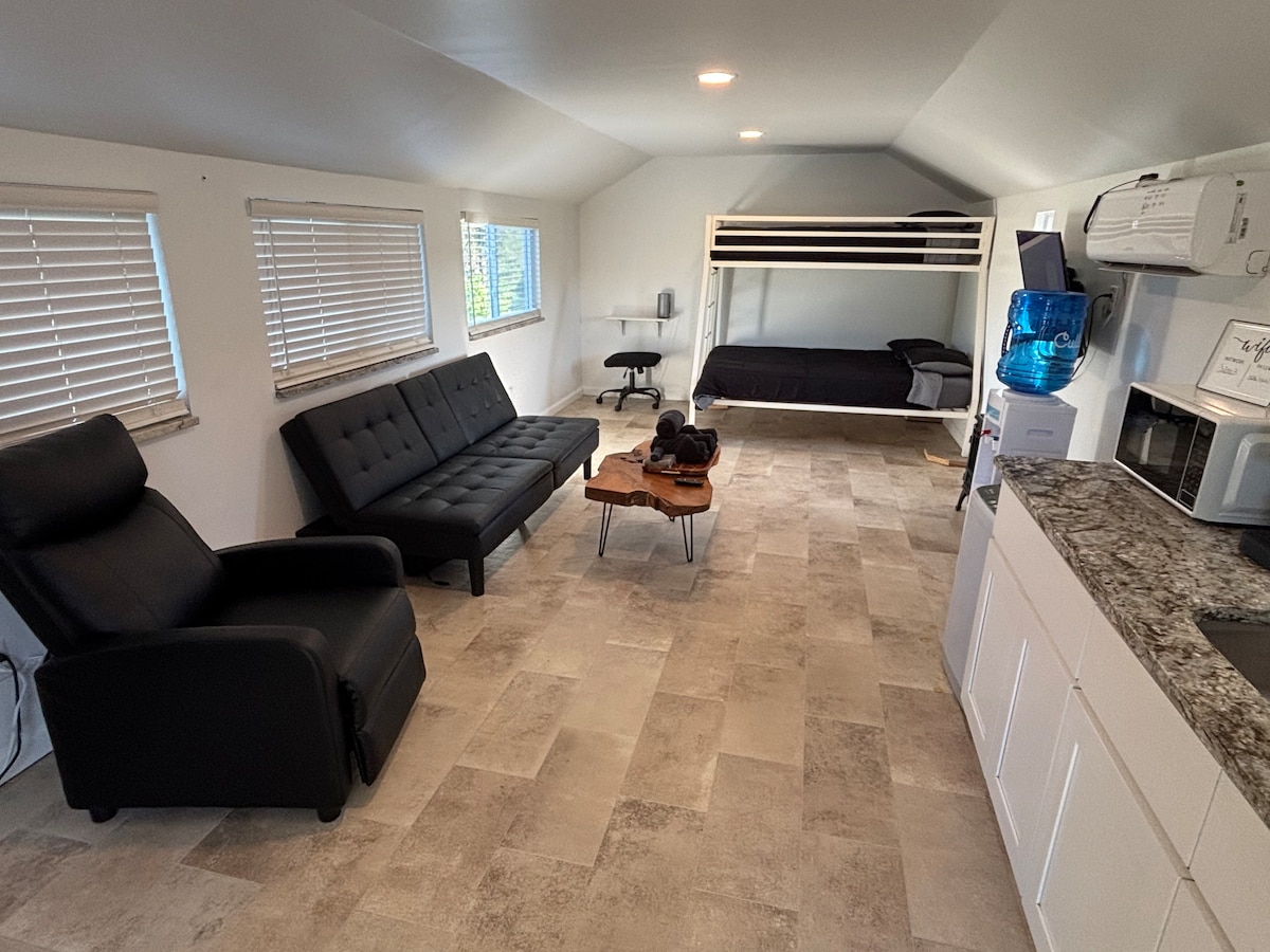 Enjoy the lovely setting of this romantic spot in nature. The cabin is located about a mile from one of the prettiest spots on big river with a public access. Coffee shops, restaurants and ice cream parlors are all within 5 miles of your stay. 30+ acres of land with an established trail system for exploring. Here you can do as much or as little as you wish. No roughing it in this modern cabin! From the granite countertops to the ductless heating and cooling unit our guest are comfortable.