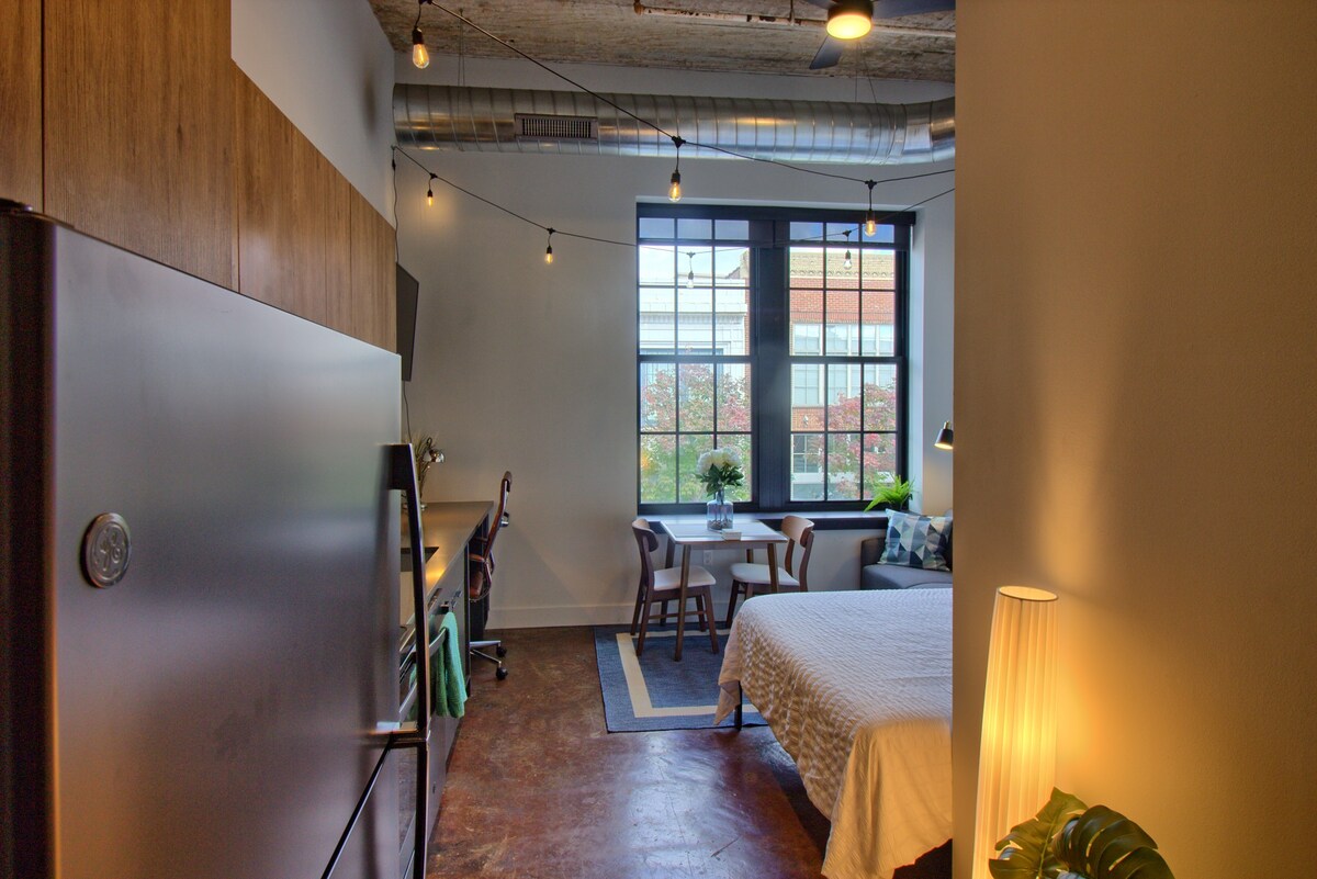 The Nash Loft is a stunning minimalist studio with 12’ ceilings, a fully-equipped kitchen with black stainless appliances and quartz countertops, a spacious walk-in closet, stackable washer + dryer, a designer bathroom with black stainless fixtures and frameless glass shower, and bright 7’ industrial steel-frame windows with views of the tree-lined street and shops below. Situated along the famous Locust Street in the heart of Midtown, you’ll be steps from SLU, Wells Fargo, BJC, and the Grove.