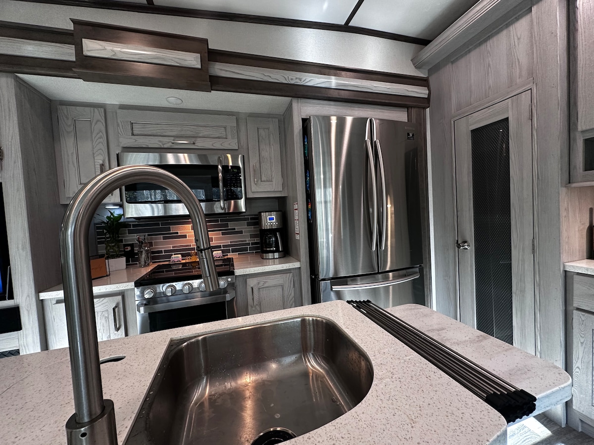 A Beautiful remodeled Country Rv 5th wheel large living space/dining and kitchen space combined. good size shower for those larger guests. The Beautiful Bedroom adorns a Queen size bed with the warm look of country.