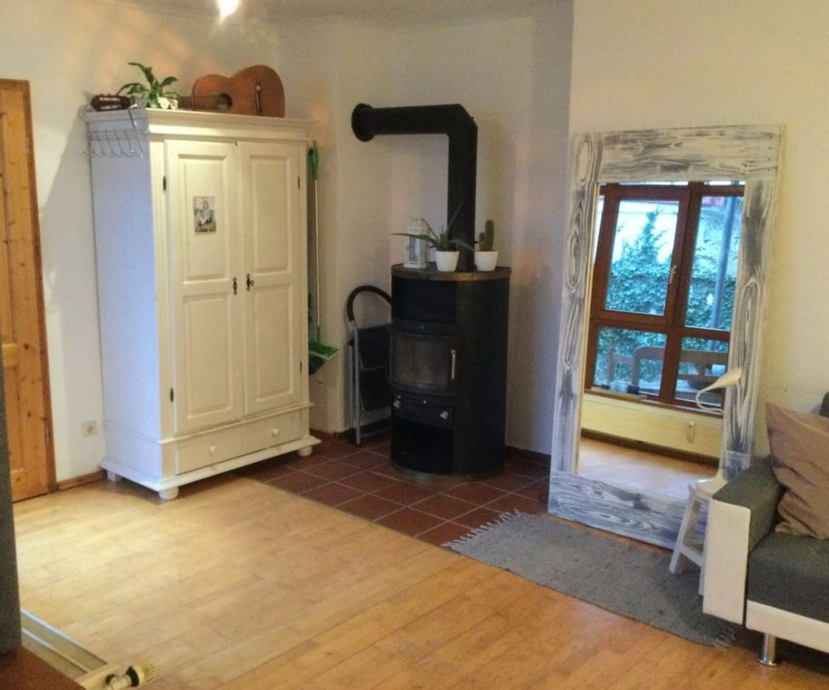Our barn apartment with great beds from great-grandmother's time is equipped with a cozy sitting area, 2 TVs and Wi-Fi. In the bedroom, 3 people can stay overnight, plus 4 guests in the living room. (Double bed 2 × 2 m and pull-out sofa 120 × 200). The kitchen invites you to cook. The bathroom has a shower, toilet and sink. The apartment has its own entrance. You will stay alone very quietly in the barn directly by the garden. Our wallbox in the yard ensures the greatest refueling comfort of the electric car.