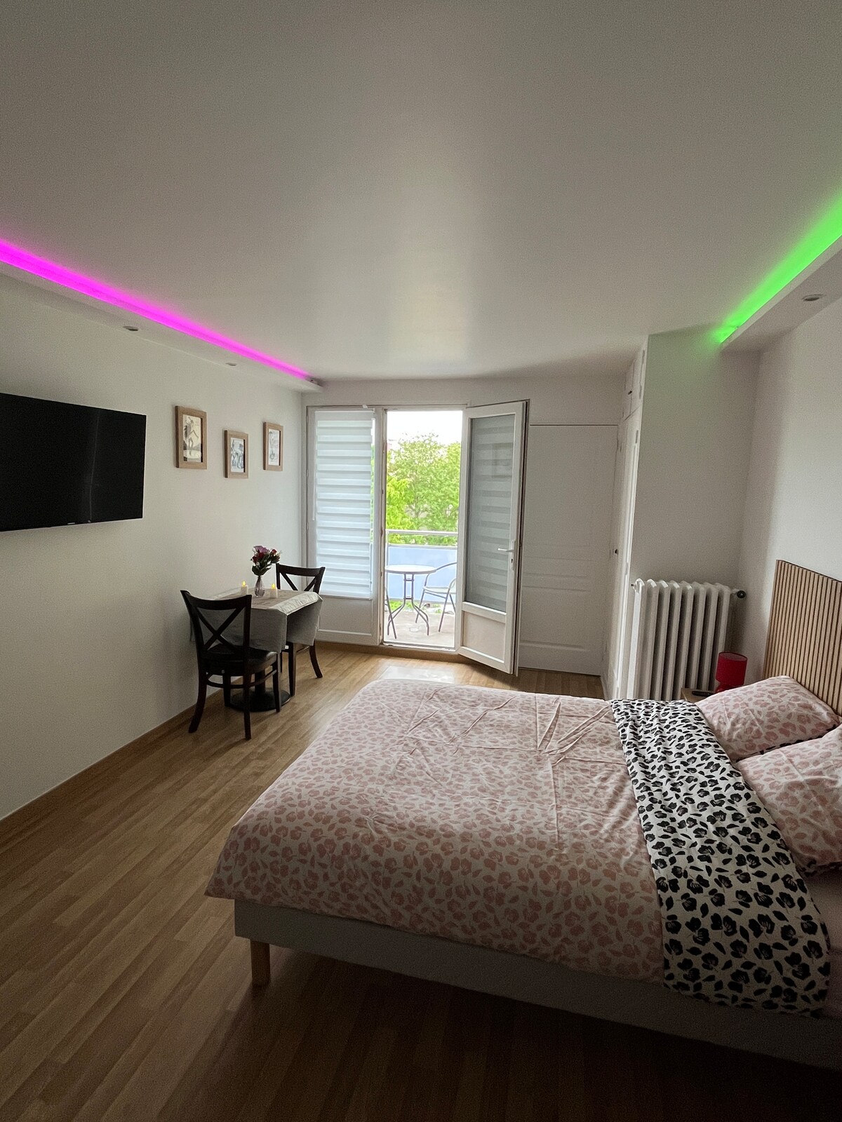 Studio with furnished balcony refurbished in a modern and bright style, ideally located in the city center and a stone's throw from Paris, the Stade de France, transport (tram T5 RER D metro 13 bus 168 & 361) and all shops. Cozy sleeping area, equipped kitchen, modern bathroom, Wi-Fi and TV. Customizable LED atmosphere change the atmosphere in the blink of an eye-chill romantic cozy up to you. Small terrace, a real plus! Have your coffee in the sun or a quiet evening. Private parking.