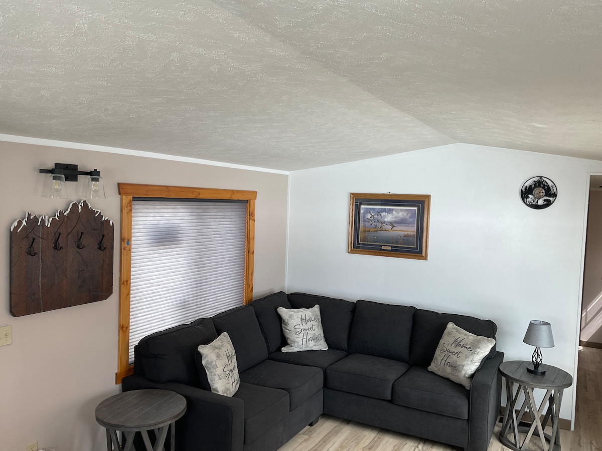 You’ll have a great time at this comfortable, newly renovated manufactured home on a private view lot. Very clean, located at the end of a quiet dead end street with stunning panoramic views of the Sawtooth Mountains and Meadow. The 728 sq-ft home accommodates two people only, including children, includes a full kitchen and washer and dryer. Close enough to walk to downtown Stanley (10 minutes) and an 8 mile drive to Redfish or Stanley Lake. Sorry, no pets or smoking in or on the premises!
