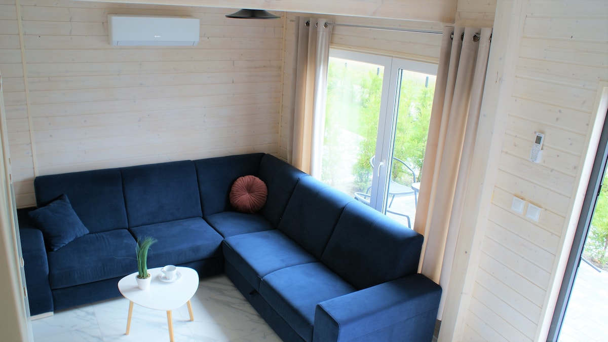 Komfortowy Dom o powierzchni 74 m2, z prywatną strefą SPA (jacuzzi i sauna sucha - na wyłączność, bez dodatkowych opłat). Ogrodzona działka daje poczucie własnej przestrzeni i prywatności. 2 sypialnie (w każdej sypialni łóżko 160x200 cm oraz rozkładana sofa 120x190 cm). Z panoramicznego okna jednej z sypialni roztacza się piękny widok. Na tarasie znajduje się grill gazowy, duży stół i 6 krzeseł oraz wygodny bujany fotel. Leżaki i parawan plażowy. 2 miejsca parkingowe.