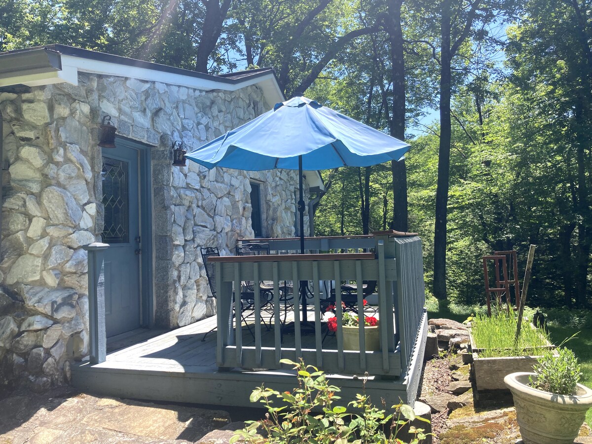 The oldest house in town, fully renovated. Beautiful two-story living room with leafy, private back deck for meals outside. Kitchen with stone counters, gas cook top, and dishwasher; two bathrooms with warm floors. Floorboards upstairs a foot wide; queen size bed with view over the trees, creek and porch.