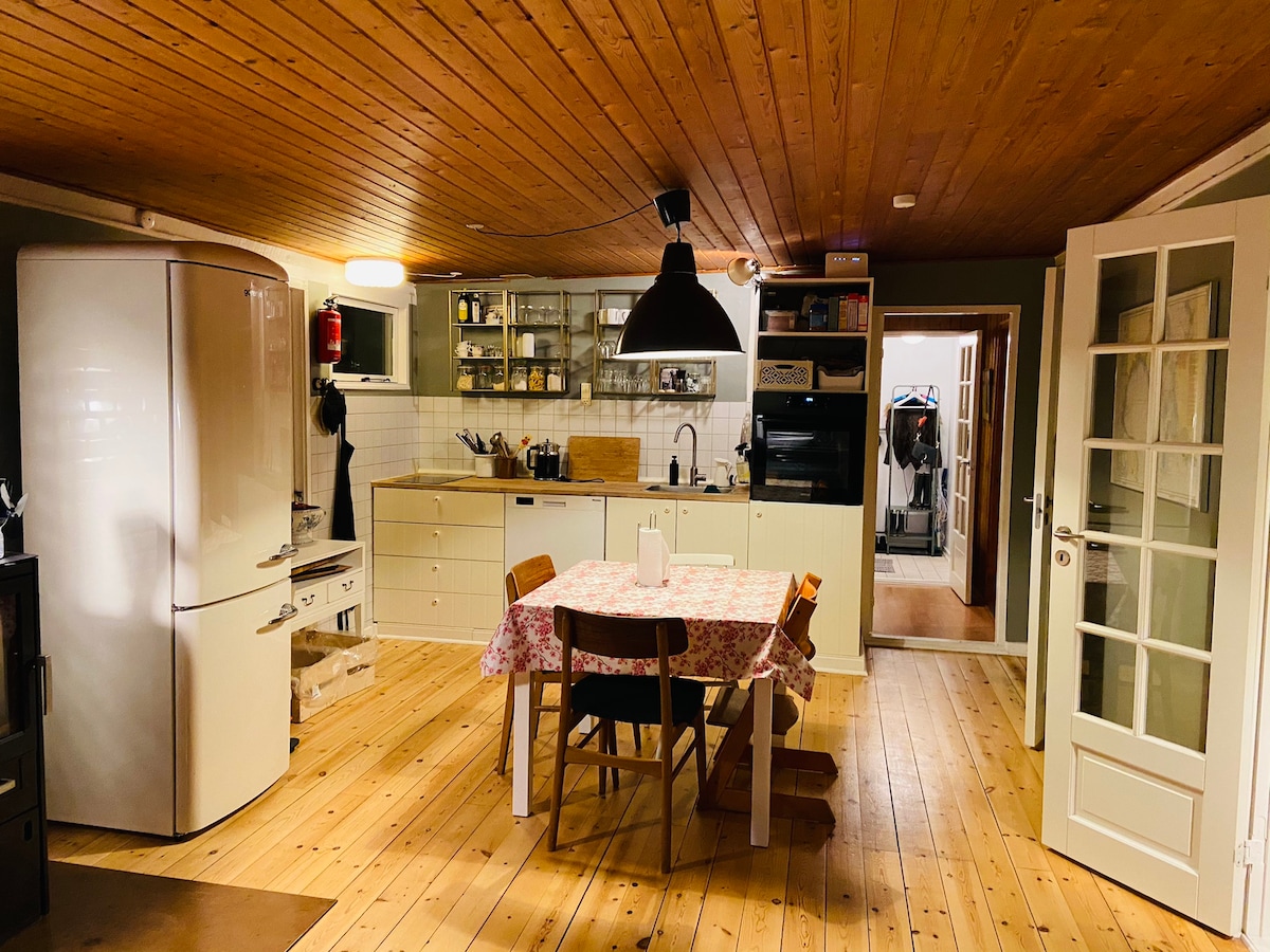Only 200 meters from the beach 🏖️is this charming cottage, embraced by tall trees 🌲 and birdsong. Enjoy meals from the sunny ☀️terraces while letting the calm seep in. Don't be surprised if a 🦌 or a 🐿️ passes by – nature 🌳is right around the corner. Indoors, real cottage cosiness awaits ☕️with original furniture and warm wooden details. The soft sofa invites you to immerse yourself in a good book 📕 and through the large windows of the living room, the light flows in and casts glimpses of the garden into the room.