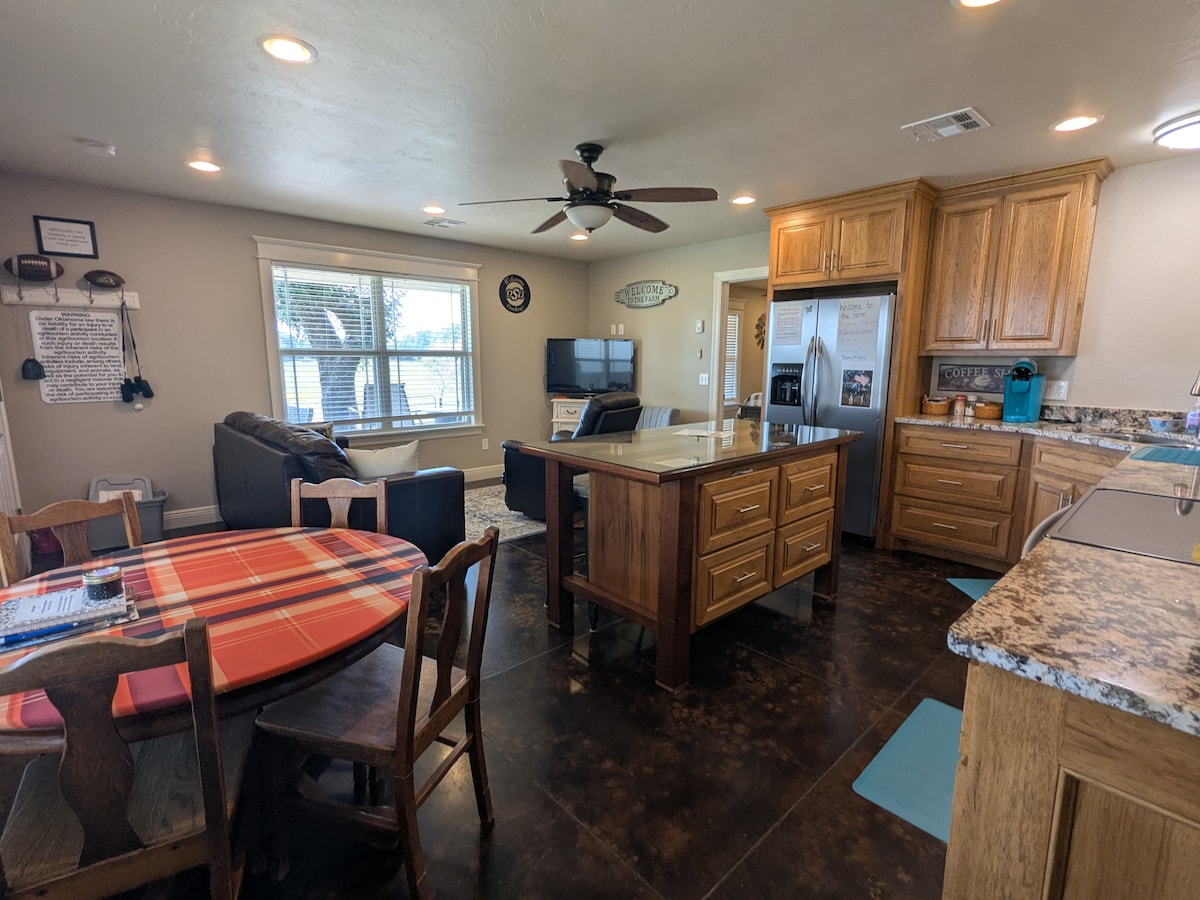 Wi-Fi Pet friendly Close to I-44 between Oklahoma City and Tulsa 3 acre fenced yard Our guests have described our 280 acre farm as: Majestic Breathtaking Immaculate Scenery felt like a movie scene Stunning Sunsets, Sunrises and Stars Gorgeous valley view Country solitude Welcome to a peaceful escape in our beautifully remodeled farmhouse with views of the picturesque mile long valley. Enjoy watching the cattle and donkeys in the pasture and the other wildlife that make their home here.