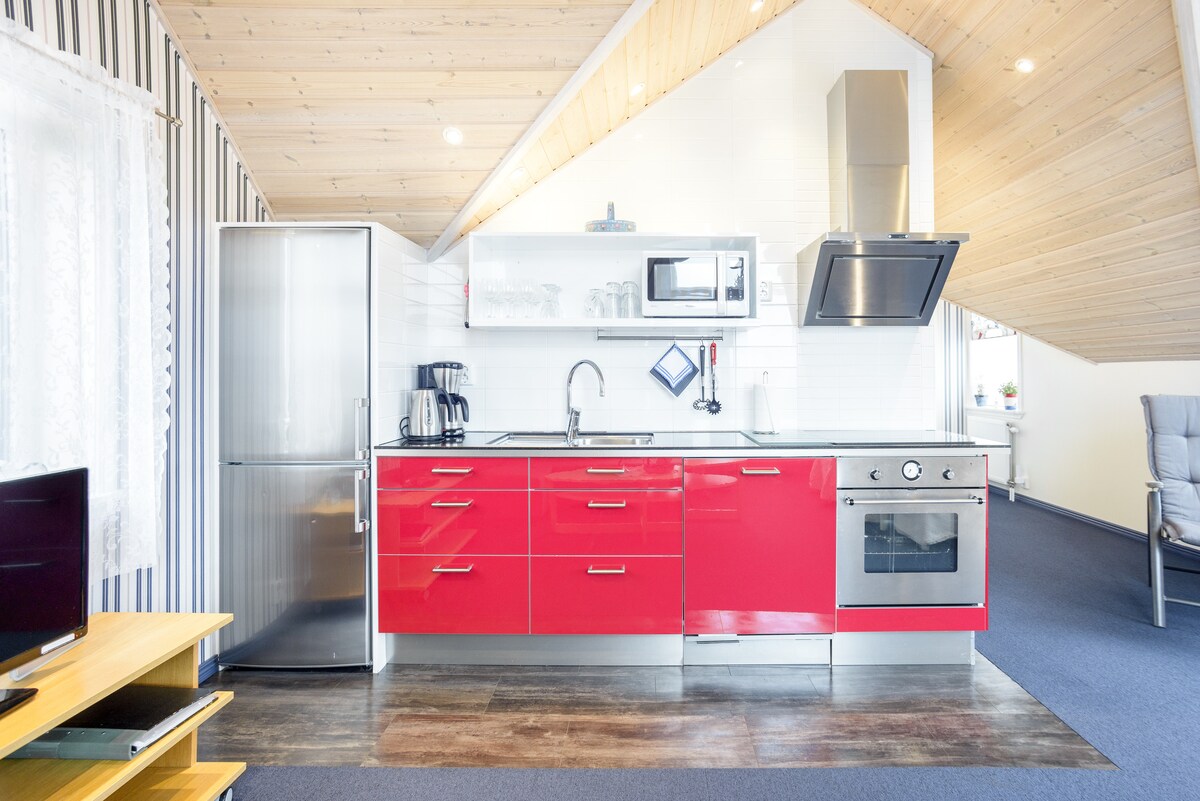 Welcome to our fully equipped cottage of 25 sqm + sleeping loft in a fantastic environment in the heart of nature, in a garden, 150 m/2 min from swimming (beach/cliff/jetty). The house is brightly decorated with natural materials, large windows, exit to its own balcony, fireplace for cozy moments, sleeping loft for cozy children/adults who want to be a little on their own sometimes. Move freely in our garden, where you can find your own nook to sit in, lie in a hammock and just be. Non-smoking accommodation, small dog is ok, not in bed.