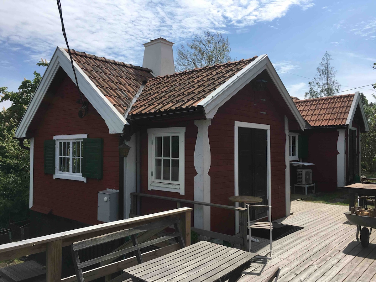 Charming 130-year-old cottage (90 m²) with a modern yet cosy feel. Two renowned spas (Yasuragi & Skepparholmen) within walking distance. Bottom floor: kitchen and dining area with classic wood stove, living room and bathroom. Your own garden and spacious wooden deck—perfect for sunbathing or BBQs. Set in a beautiful area with a crystal-clear lake for bathing just 200 m away, with a nature reserve surrounding it. Sea dock ~700 m. 30 minutes to Stockholm by Waxholm boat, bus or car.